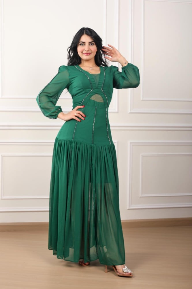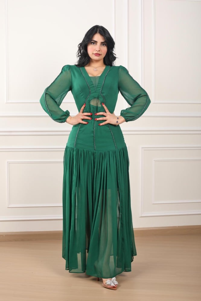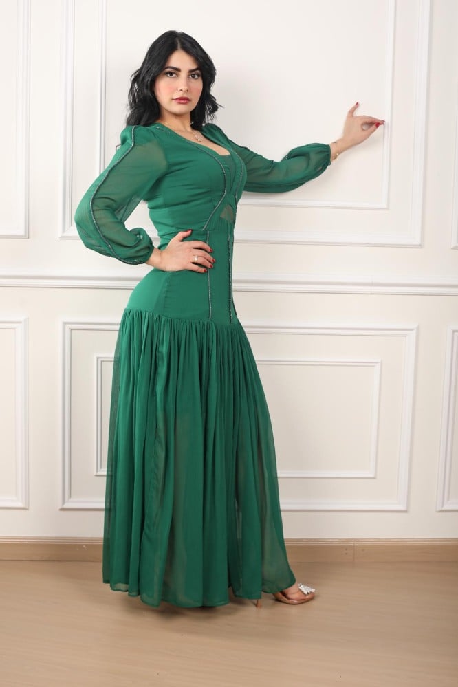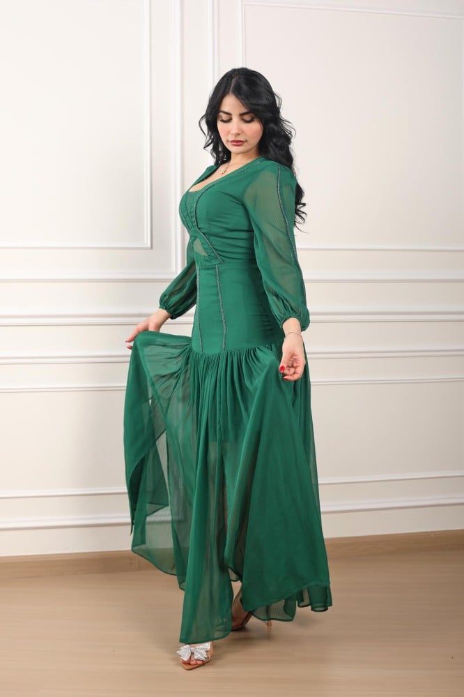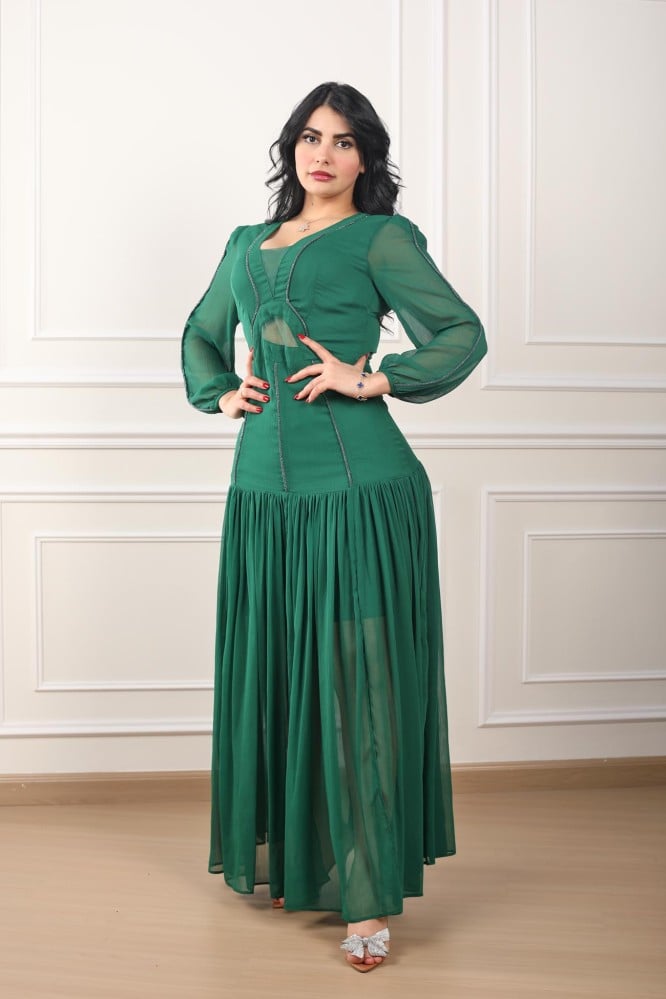 اكتشفي الأناقة والرقي مع فستان السهرة الشيفون الأخضر، المصمم ليمنحك إطلالة مفعمة بالأنوثة والسحر في جميع مناسباتك.