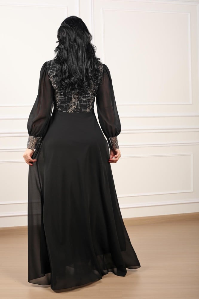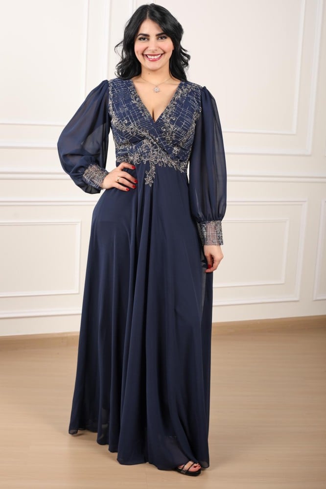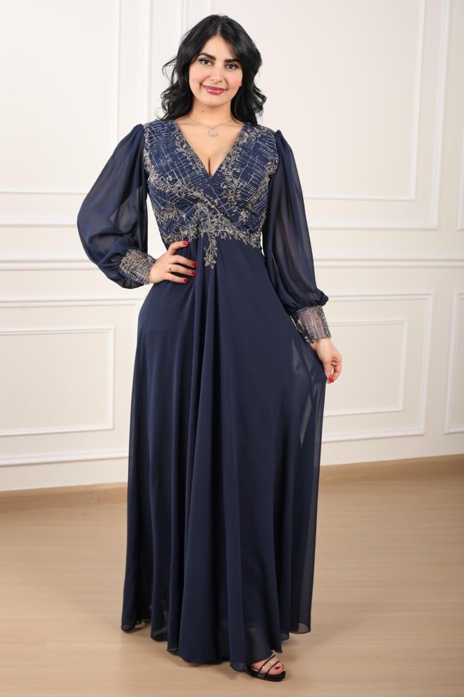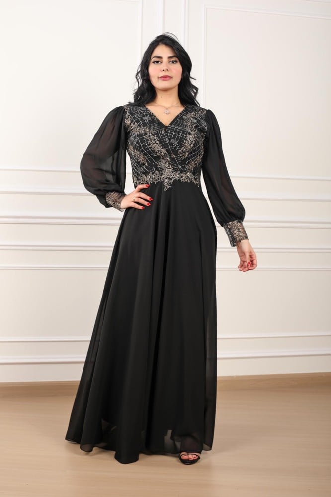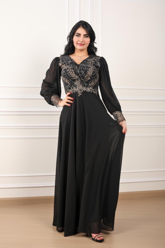 فستان طويل شيفون كريب سهره الصدر مطرز بشك ذهبي واكمام طويلة.