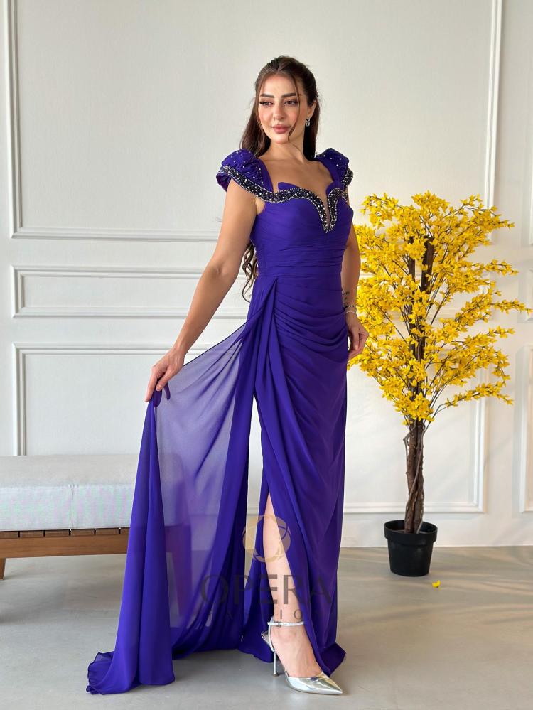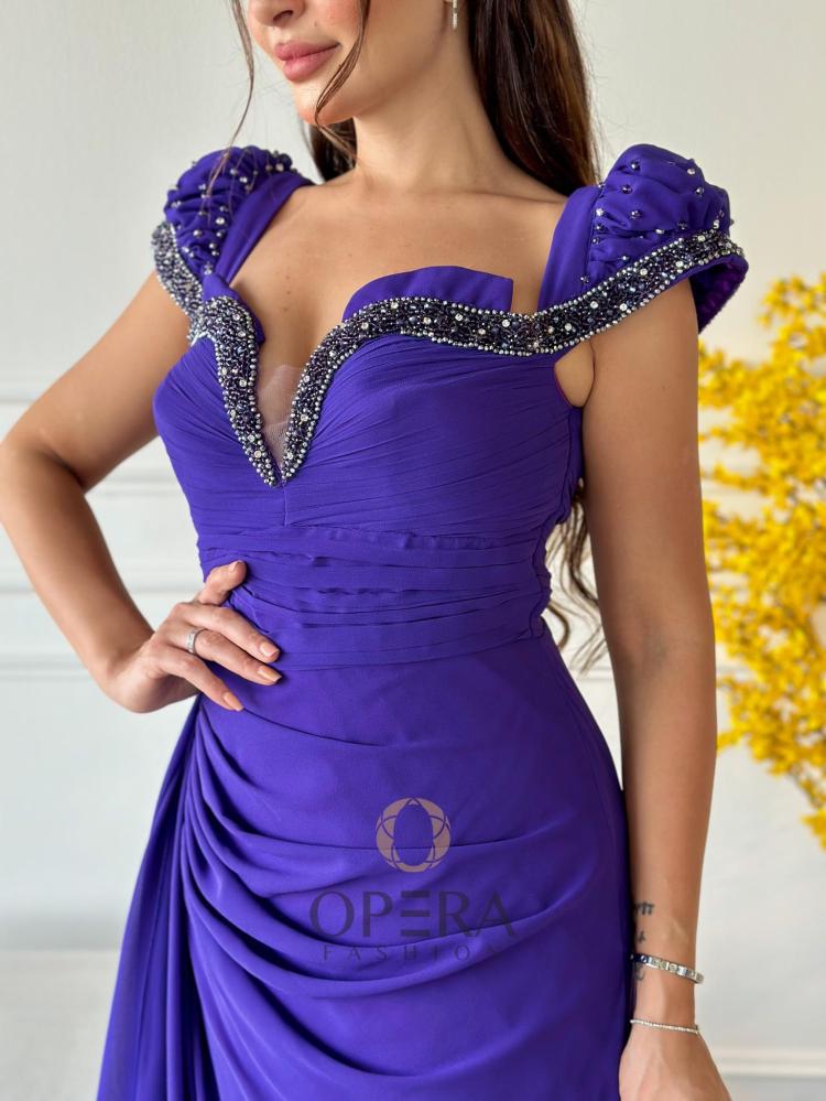 فستان سهرة أنيق باللون الليلكي مصنوع من قماش الشيفون، مزين بالكريستال على منطقة الصدر وقطعة جانبية منسدلة، لإطلالة فاخرة وجذابة في المناسبات الخاصة.