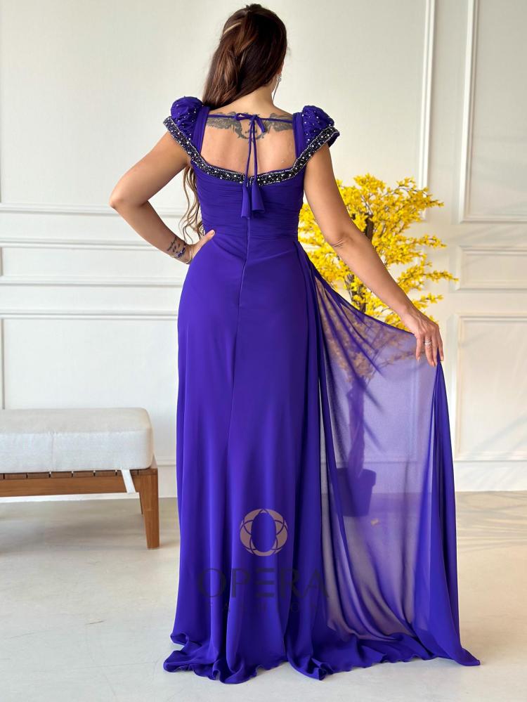 تألقي بإطلالة مميزة وساحرة في مناسباتك الخاصة مع هذا الفستان الليلكي الفاخر المصنوع من قماش الشيفون الناعم. يتميز الفستان بتصميم أنيق يشمل تزيينات بالكريستال البراق على منطقة الصدر، مما يضيف لمسة من الفخامة والتألق. القطعة الجانبية المنسدلة تضفي لمسة درامية وجذابة على التصميم، بينما تبرز قصة الفستان جمال قوامك بأنوثة ورقي. ارتديه مع إكسسوارات بسيطة وحذاء بكعب عالي لتكملي إطلالتك البهية وتخطفين الأنظار في كل مناسبة.