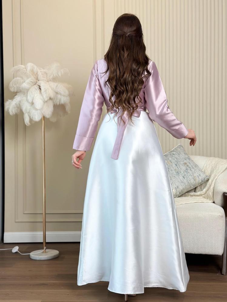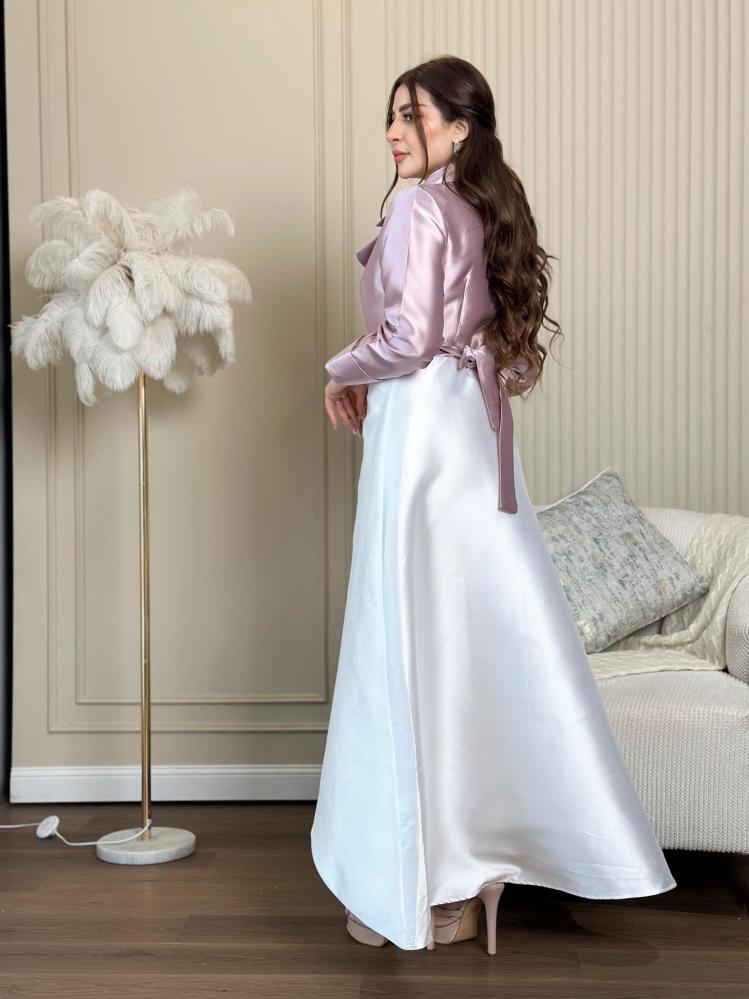 فستان سهرة قطعتين القطعه الداخلية ساده والخارجية قماش تفتة لونين من الاعلى لون موف بياقة واكمام طويلة ومن الاسفل لون ابيض مع حزام