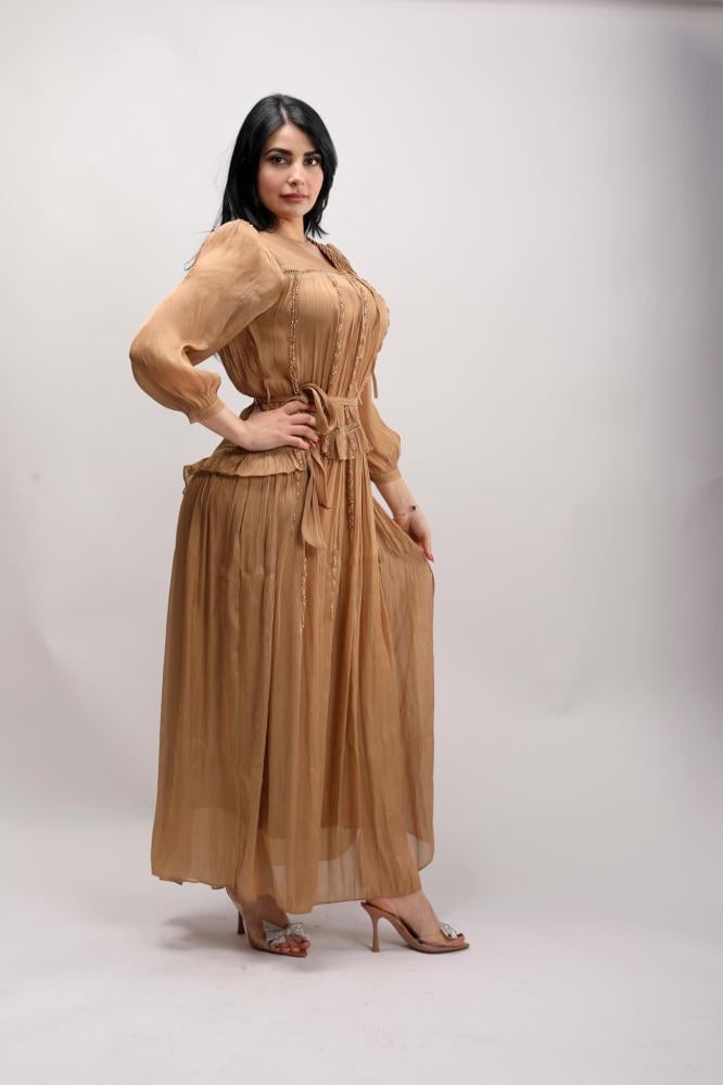 فستان طويل قماش كريب لمعة اكمام طويلة على خطوط تطريز فصوص بنفس درجه اللون الخصر طبقات بلاسية