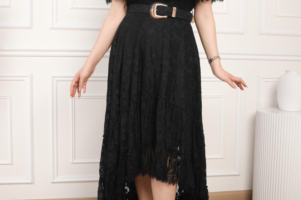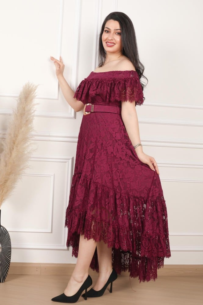 استمتعي بجاذبية لا تقاوم مع فستان السهرة الطويل المصمم بأناقة من الدانتيل العنابي، مع قصة اوف شولدر وكلوش من الأسفل، وحزام عريض لإطلالة راقية في أرقى المناسبات.