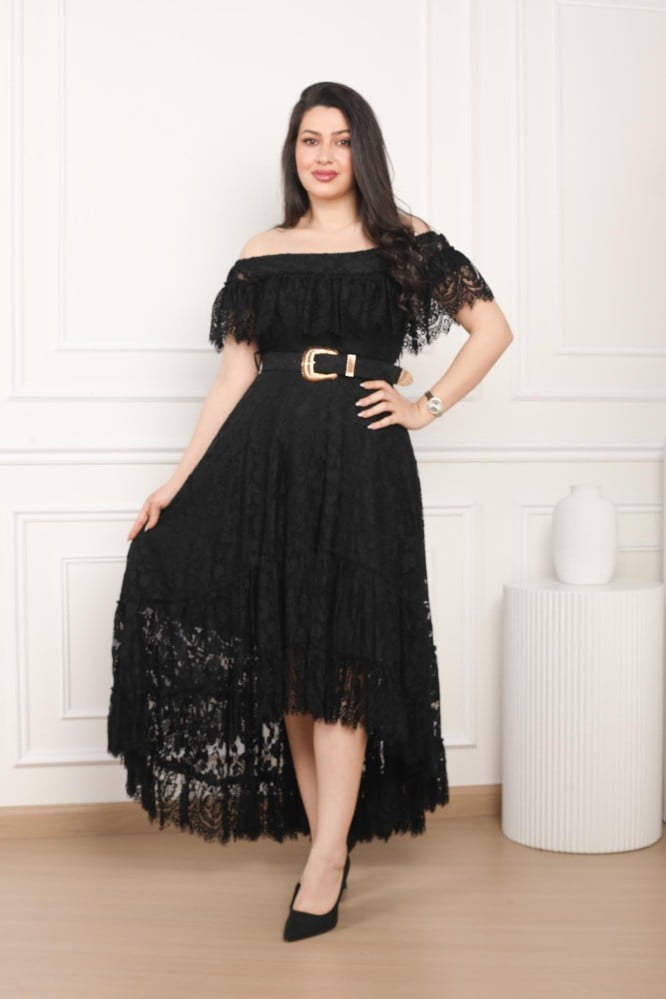 فستان سهرة دانتيل طويل بقصة اوف شولدر وكلوش من الاسفل مع حزام عريض فستان فخم يصلح للمناسبات والحفلات باطلالة راقيه