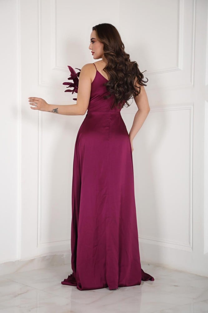 فستان سهره طويل فخم قماش حرير طايح الصدر ريش كسرات بفتحه جانبيه من الاسفل كسرات.