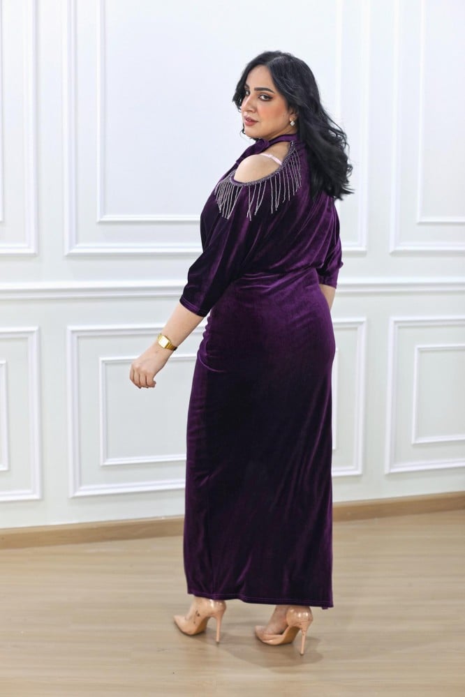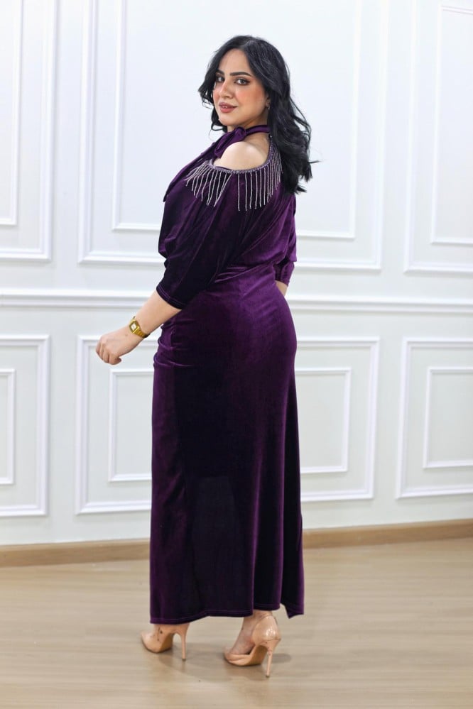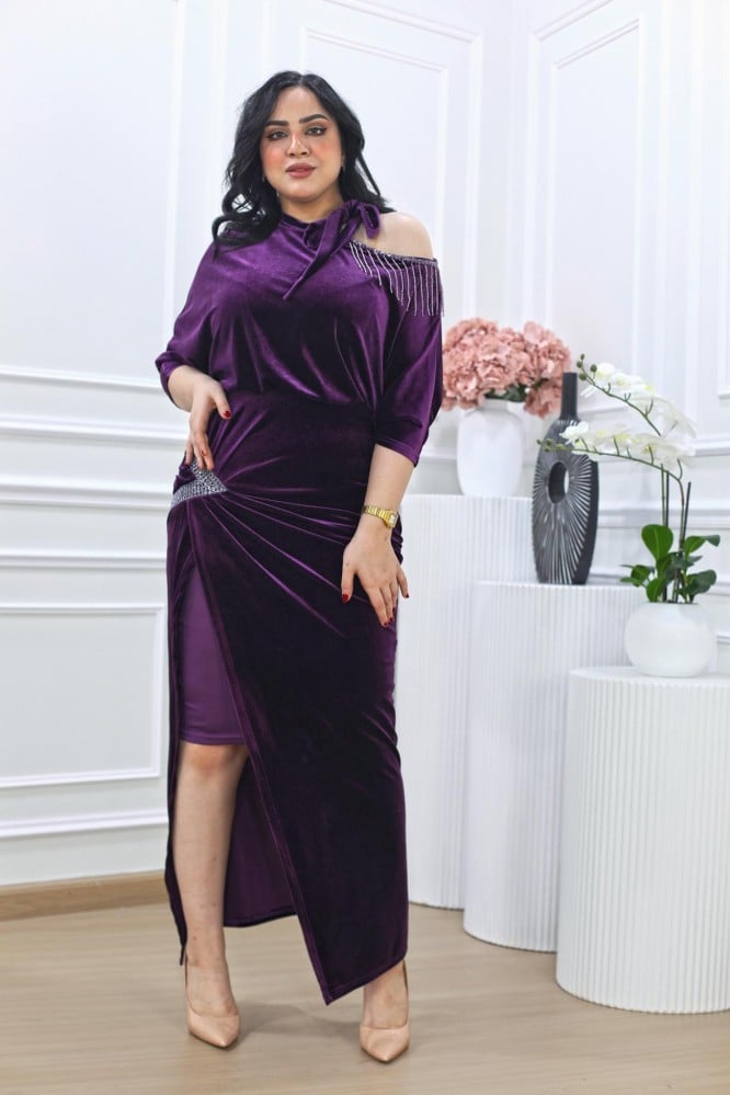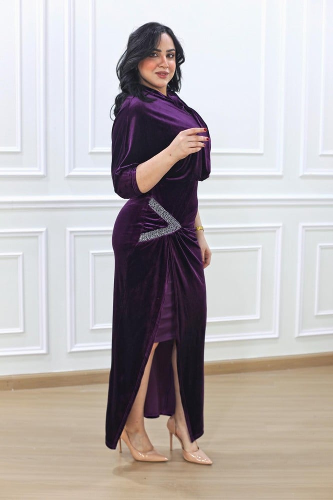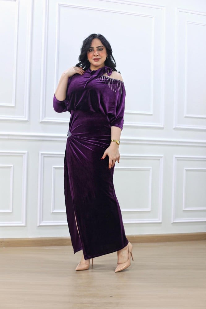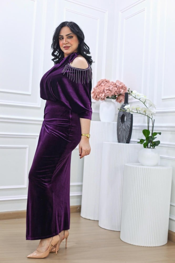 فستان سهرة موف بنفسجي استرتش مخمل مزين بكرستال ومزموم من الجنب واطراف الرقبة مطرزه.