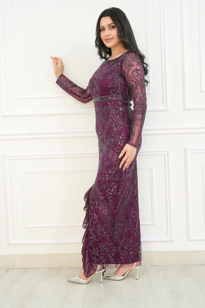 فستان سهرة مزين بشك وترتر يدوي ودرابية وفتحة بالامام لون عنابي باكمام شفافة