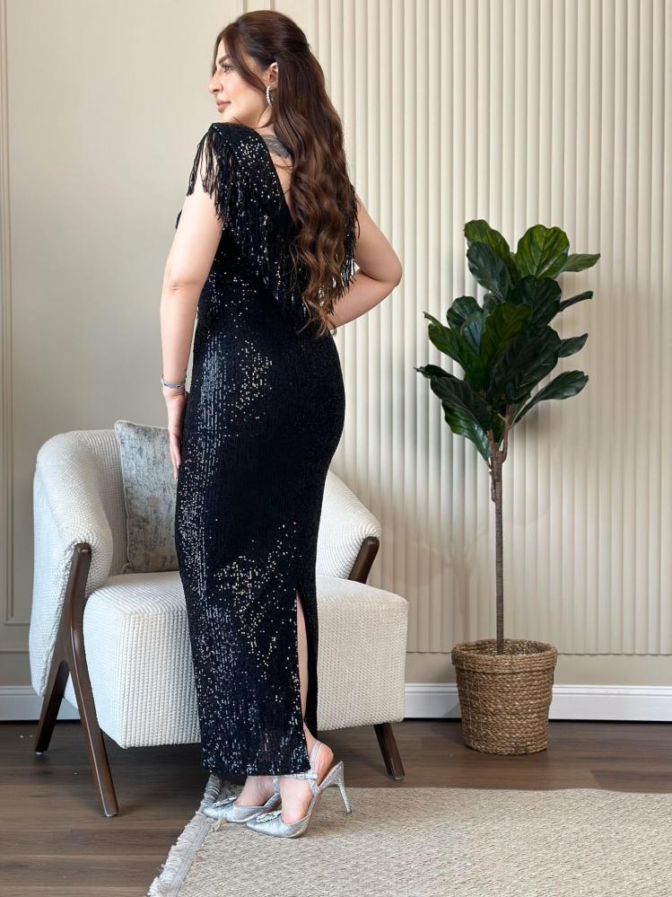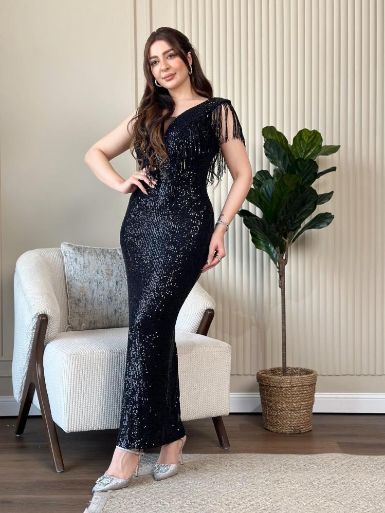 اكتشفي سحر فستان السهرة الأسود المزين بتفاصيل الترتر والهدب، تصميم يعكس الفخامة والأناقة.
