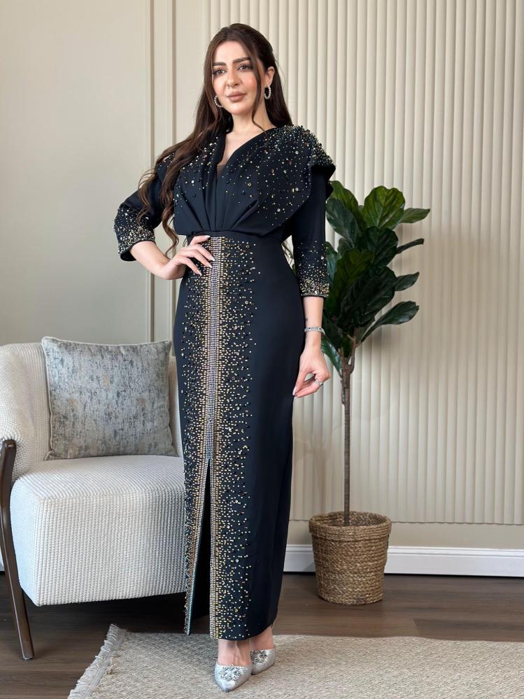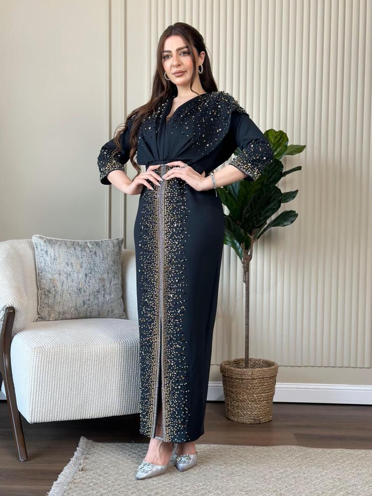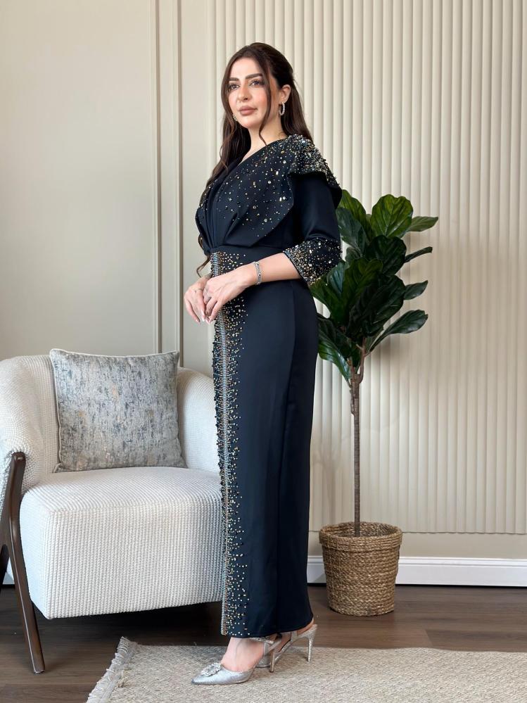 أضيفي لمسة من الأناقة إلى خزانتك مع فستان السهرة المصمم من قماش الطبي، مزين بتطريز الكريستال وشك يدوي اللامع.