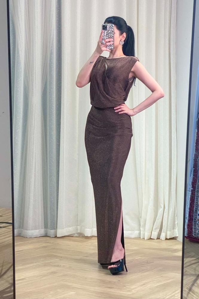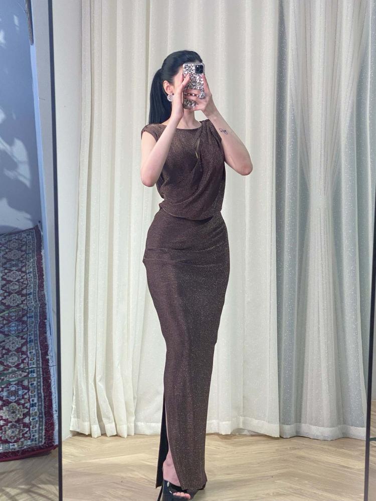 فستان سهرة قماش لمعة استرتش لون بني غامق