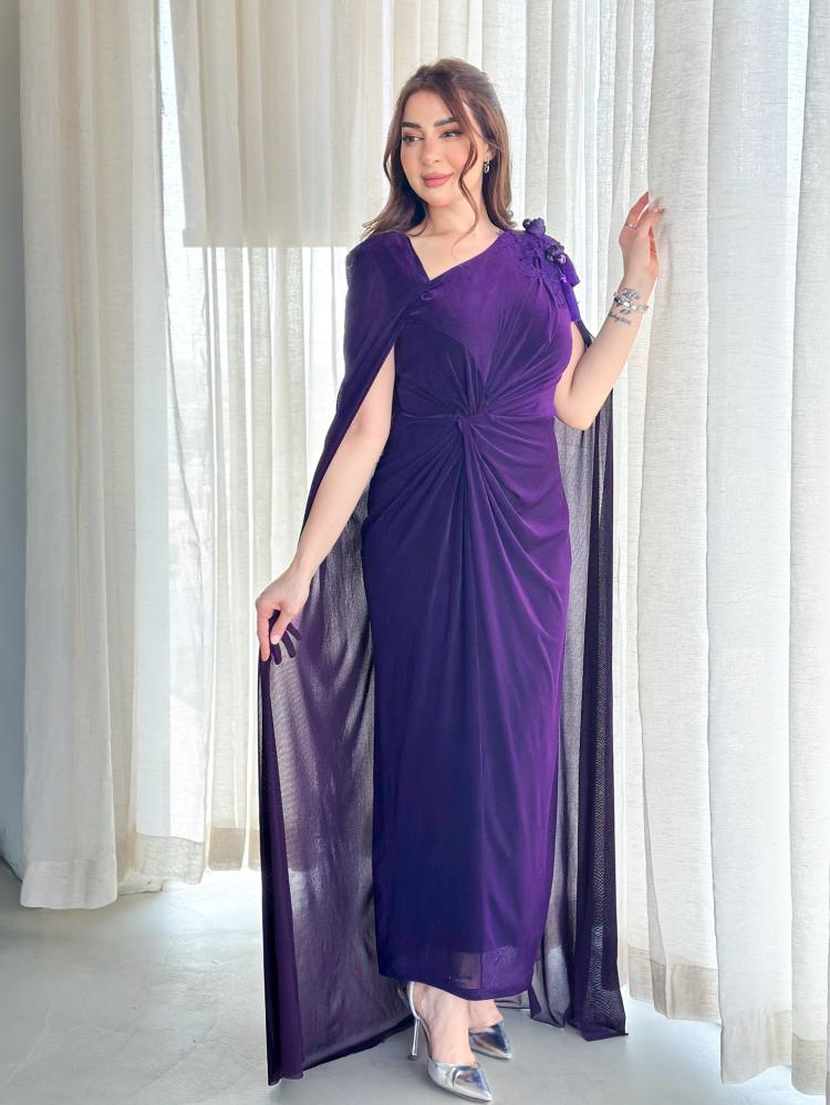 تألقي بإطلالة فاخرة وأنيقة مع فستان السهرة البنفسجي الذي يتميز بتصميم أنيق مع تفاصيل متداخلة عند الخصر ووشاح طويل يضفي لمسة من الفخامة.