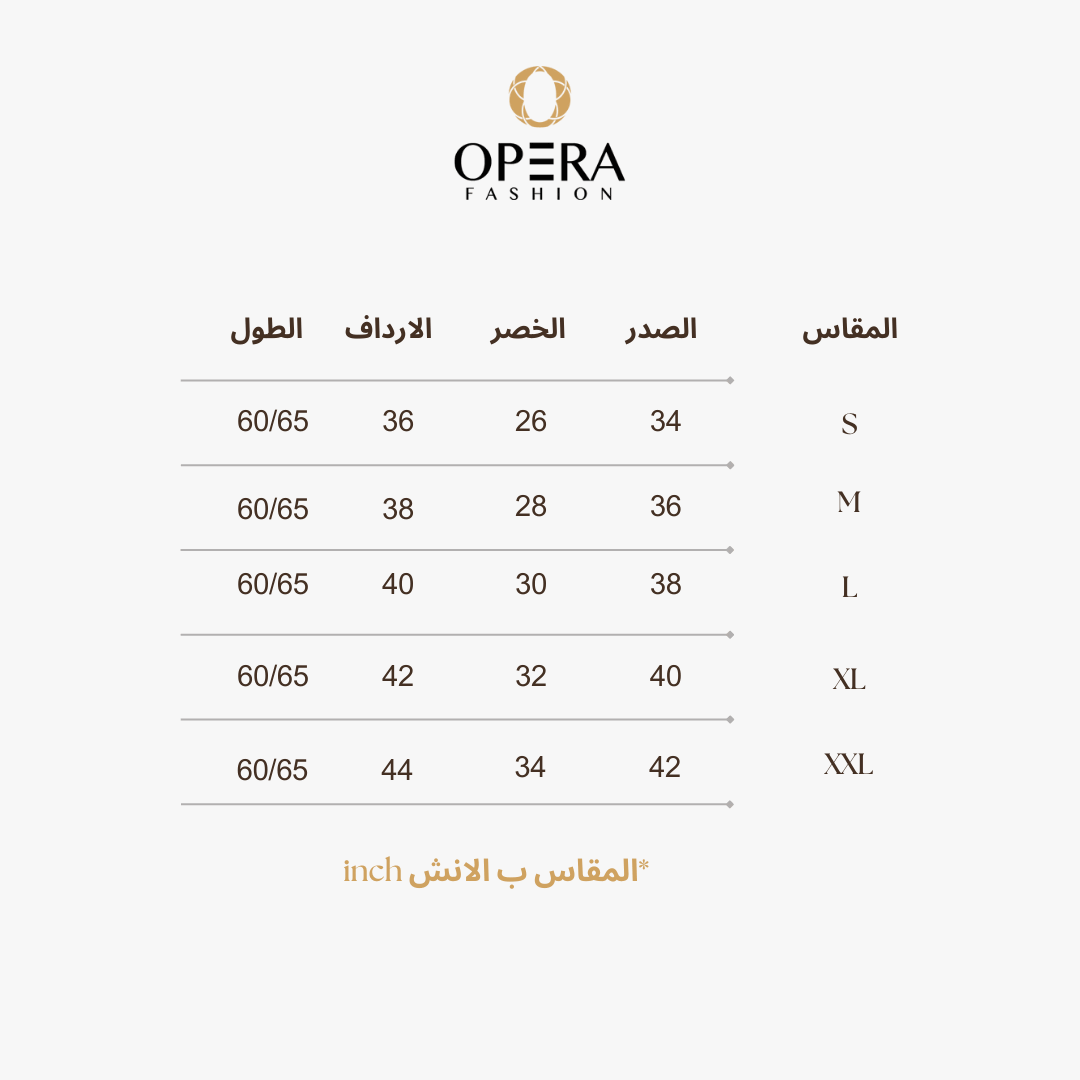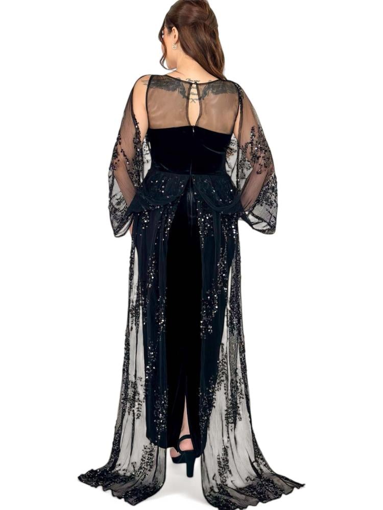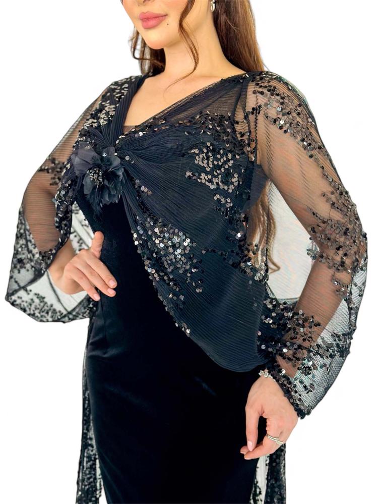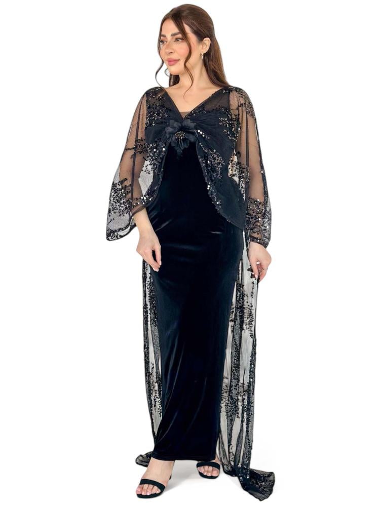 هذا الفستان الراقي مصنوع من قماش المخمل الفاخر باللون الأسود الأنيق، يتميز بتفاصيل لؤلؤية على منطقة الصدر والأكمام تضفي لمسة فاخرة ومميزة. القصة الضيقة عند الخصر تمنح الفستان طابعاً أنثوياً، فيما تأتي الأكمام الواسعة الشفافة لتضفي لمسة رومانسية على التصميم، مما يجعله مناسباً للسهرات الفاخرة.