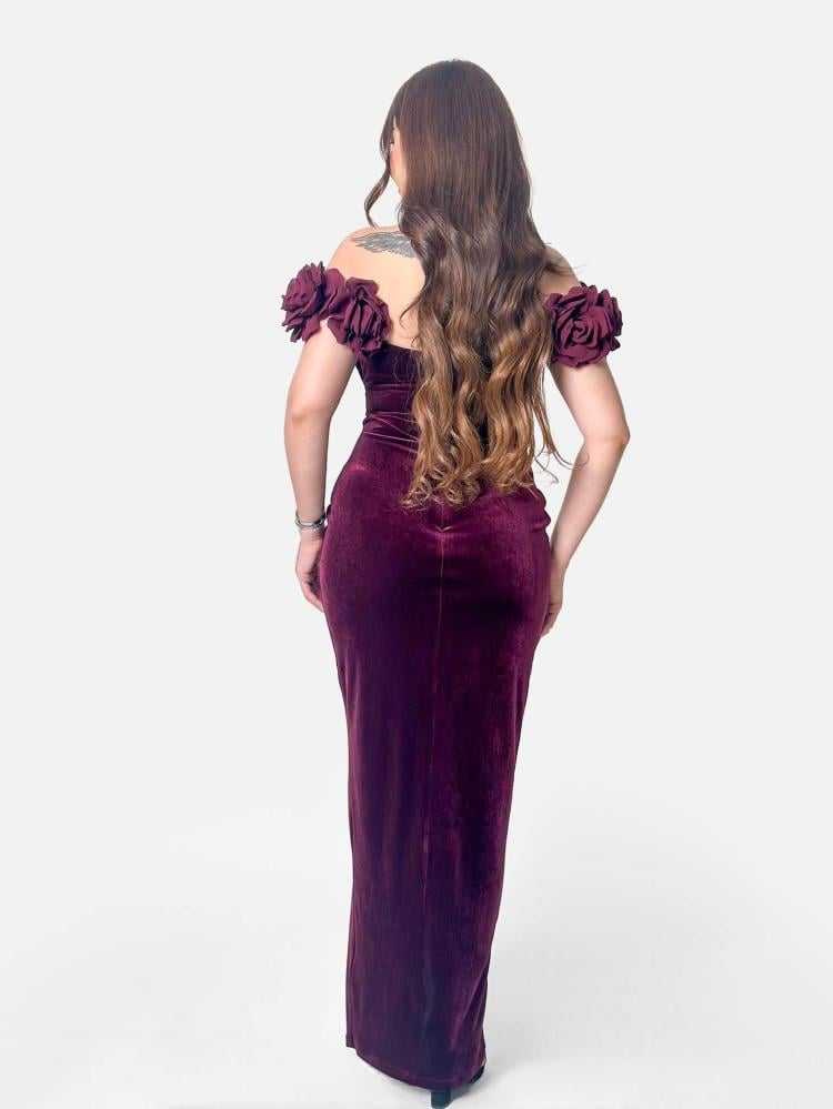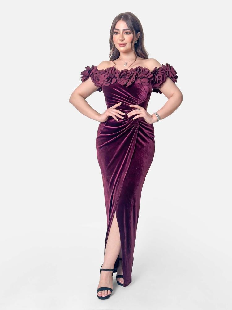 تميزي بإطلالة ساحرة مع فستان السهرة المخملي باللون العنابي المزود بتفاصيل الورود ثلاثية الأبعاد على الأكتاف، مما يمنحه لمسة فاخرة وفريدة.