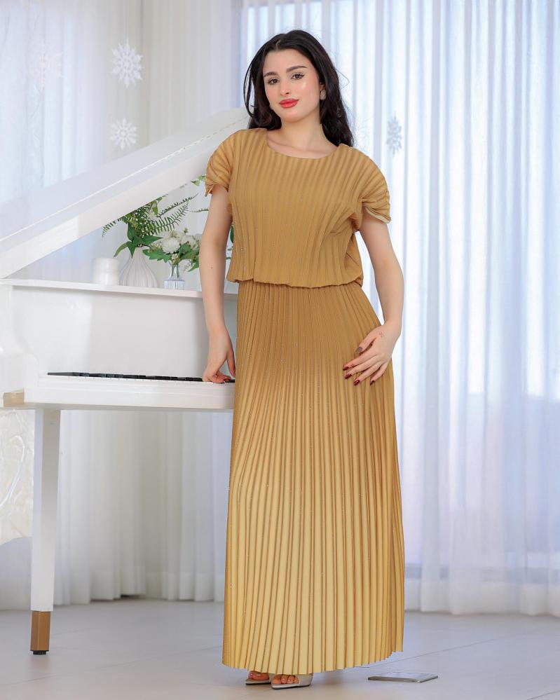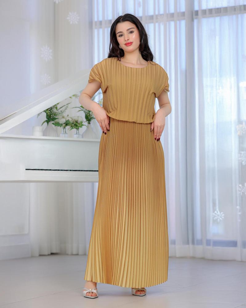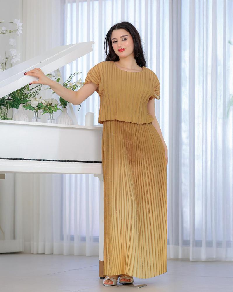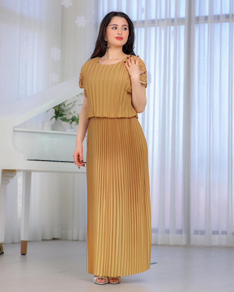 يأتي هذا الفستان بتصميم أنيق يعكس الفخامة بأسلوب هادئ ومتوازن. القماش المكسر يمنح حركة انسيابية جذابة ويضفي بعداً جمالياً راقياً على الإطلالة. الجزء العلوي بتصميم ناعم ينسدل برقي فوق القَصّة المستقيمة، ما يمنح مظهراً متناسقاً وأنيقاً. اللون يضيف إشراقة لافتة، ليكون الفستان خياراً مثالياً للسهرات، الحفلات، والمناسبات الرسمية.