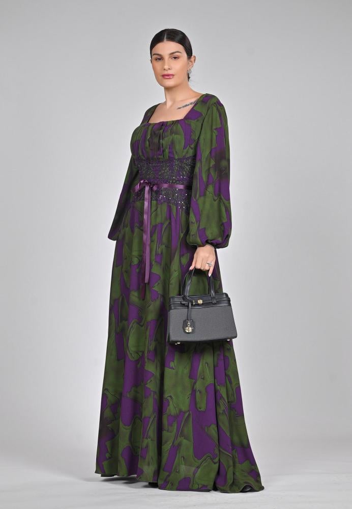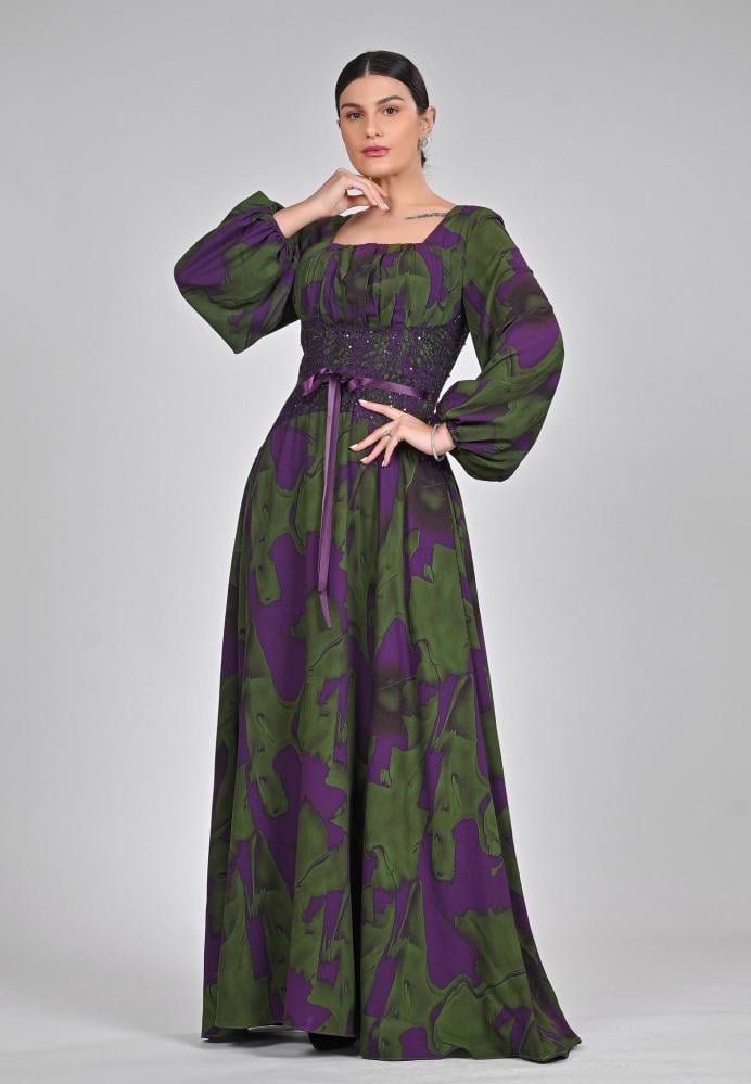 فستان سهرة فاخر من الشيفون المموج بتصميم أنثوي ناعم وأكمام واسعة، مزين بحزام أنيق عند الخصر ليضفي لمسة من الجاذبية والفخامة على إطلالتك. اختيار مثالي للمناسبات والسهرات الراقية.