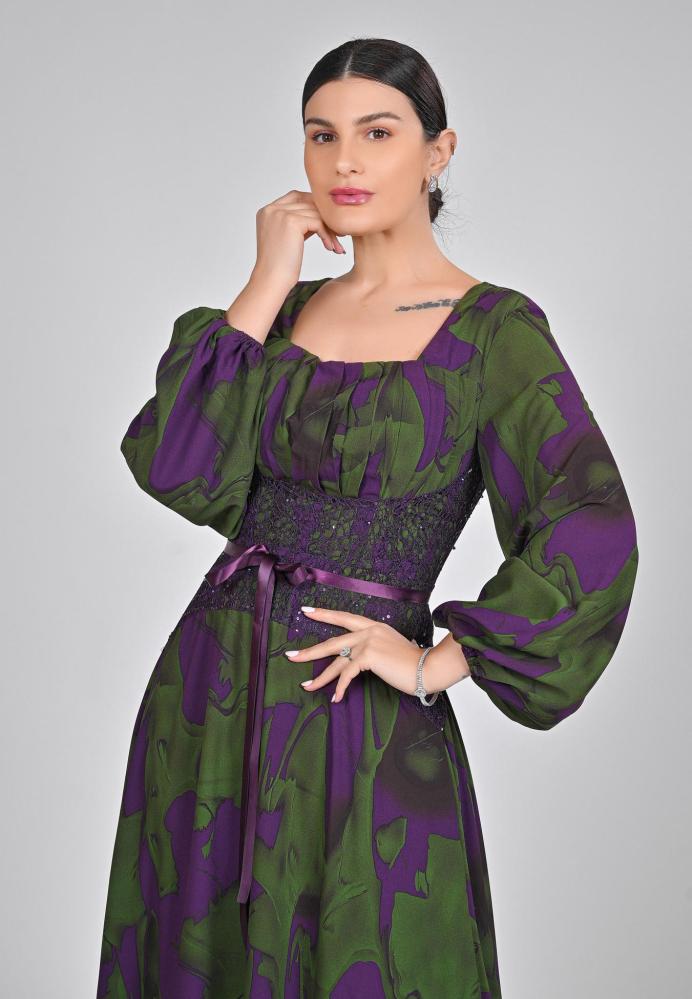 إطلالة أنثوية ساحرة مع هذا الفستان الفاخر المصنوع من قماش الشيفون المموج، الذي يمنحك لمسة ناعمة وانسيابية مثالية. يتميز التصميم بقصة أنيقة بأكمام واسعة تضفي لمسة كلاسيكية راقية، إلى جانب حزام مزين بإكسسوار فاخر عند الخصر لإبراز القوام بشكل جذاب. يتمتع الفستان بفتحة رقبة أنيقة بتصميم عصري، مما يجعله خيارًا مثالياً للمناسبات الفاخرة وحفلات السهرة.