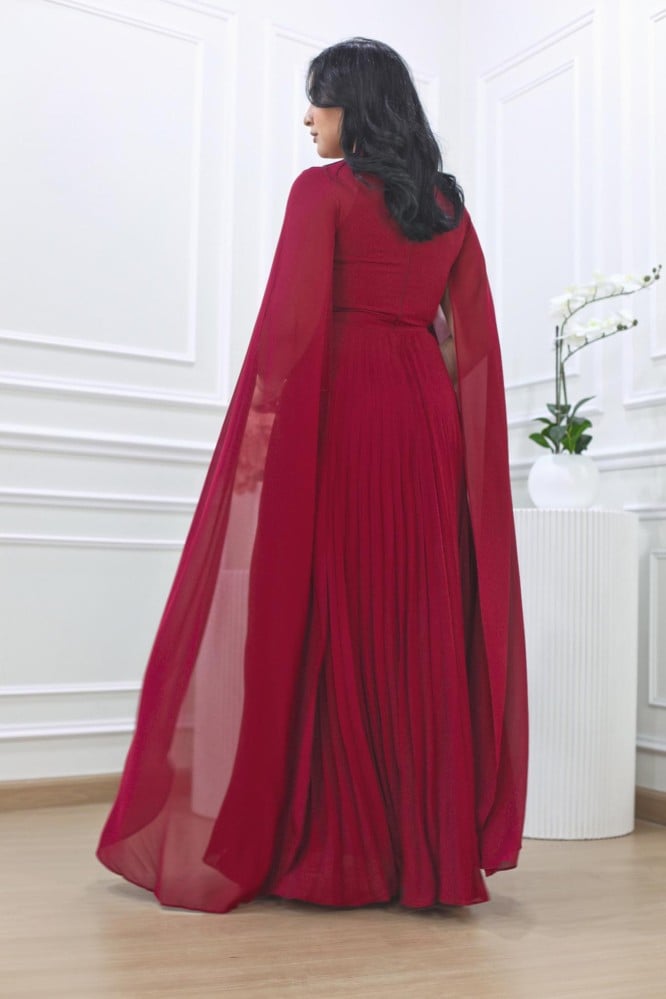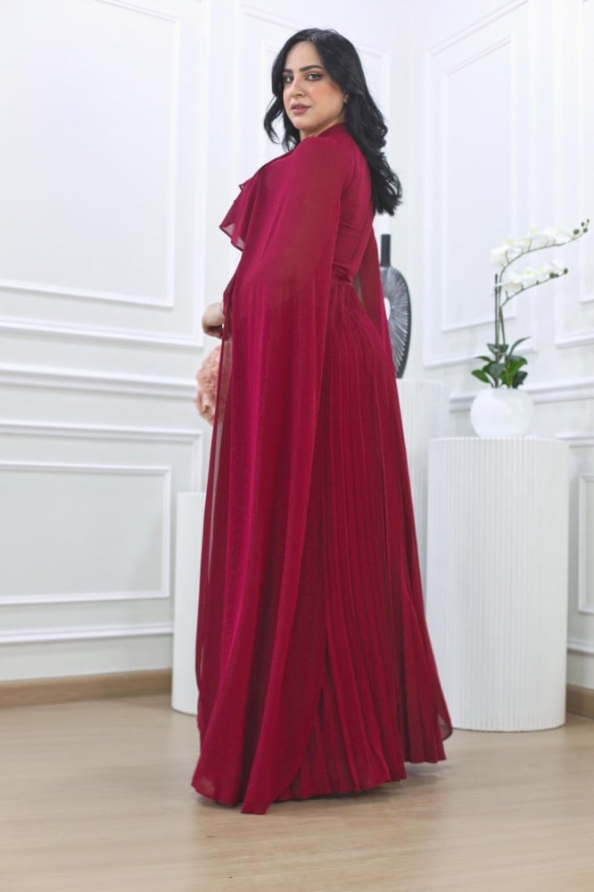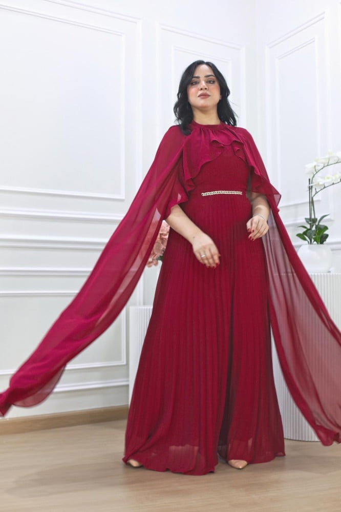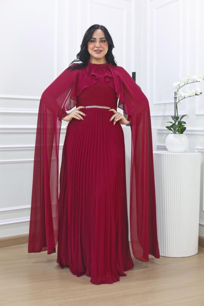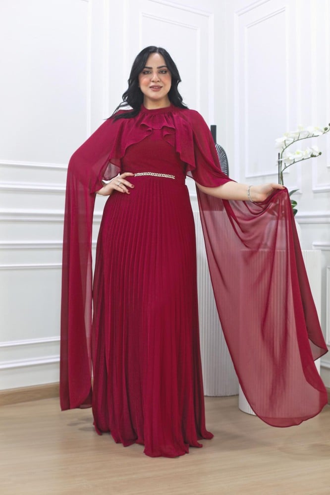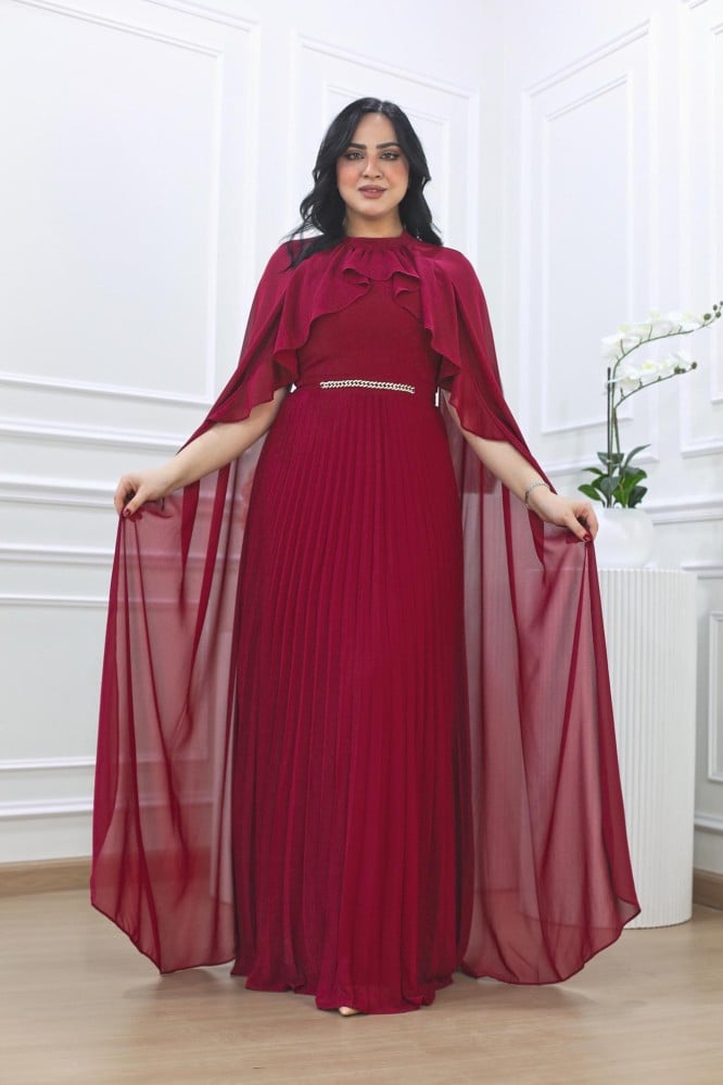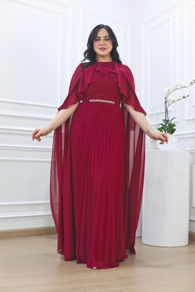 فستان سهرة ناعم طويل شيفون جورجيت بقصة من الاكمام طويله ومن الاسفل قصه كولش كسرات