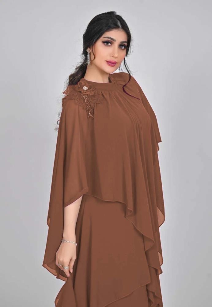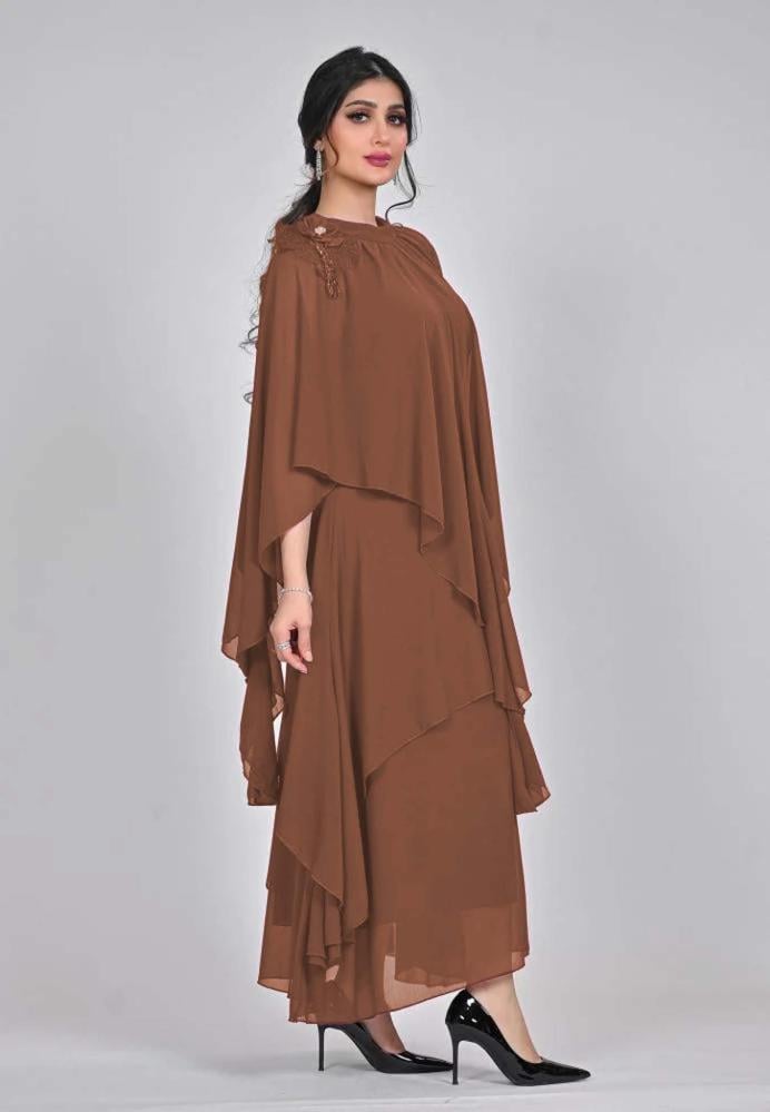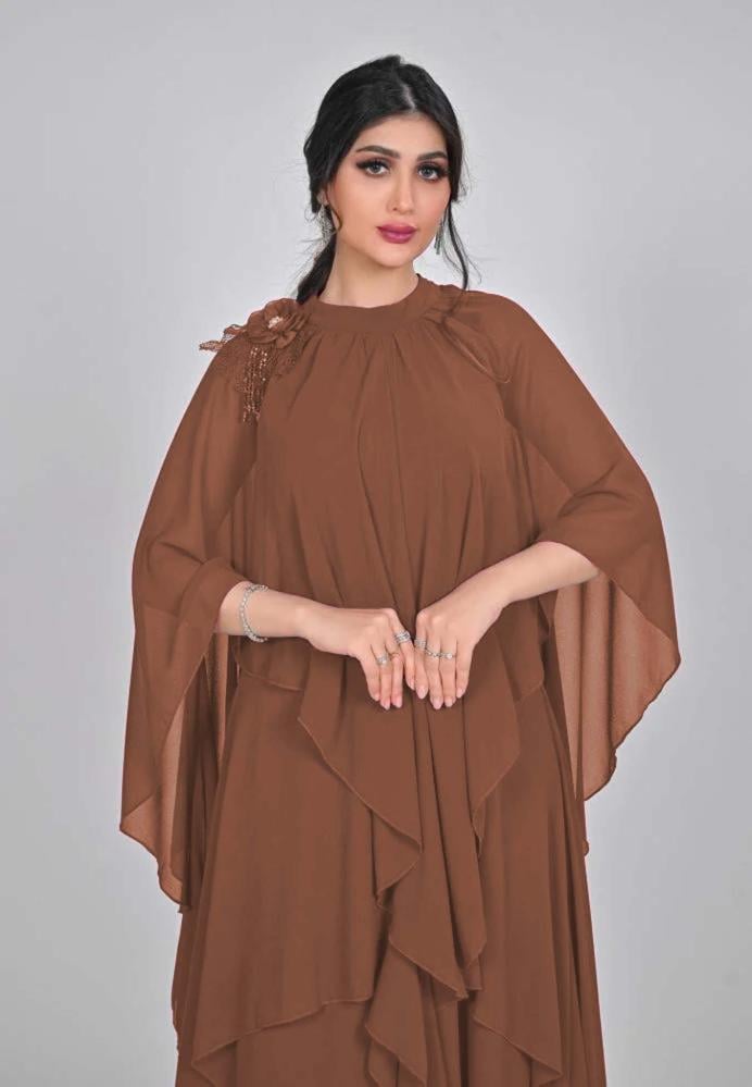 اختاري إطلالة حالمة تجمع بين البساطة والأناقة مع هذا الفستان المصنوع من الشيفون الخفيف بلون بني دافئ. يتميز بتصميم فضفاض بطبقات متدرجة تضفي حركة انسيابية وجاذبية فريدة. الوردة المضافة على الكتف تمنح لمسة أنثوية مميزة، بينما تمنحك القصة المريحة حرية وأناقة طوال اليوم. مناسب للمناسبات الخفيفة أو السهرات الراقية.