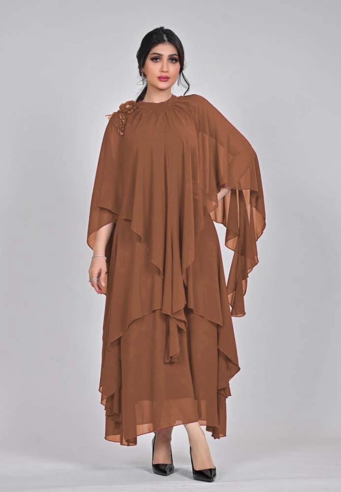 فستان شيفون ناعم بطبقات – بني مزين بوردة على الكتف