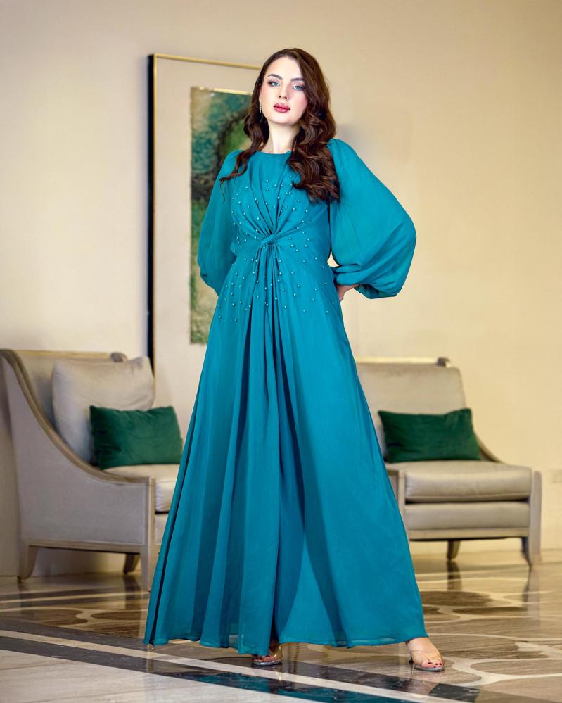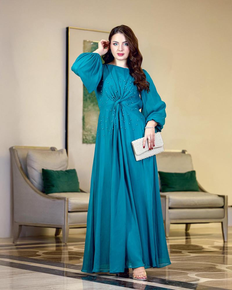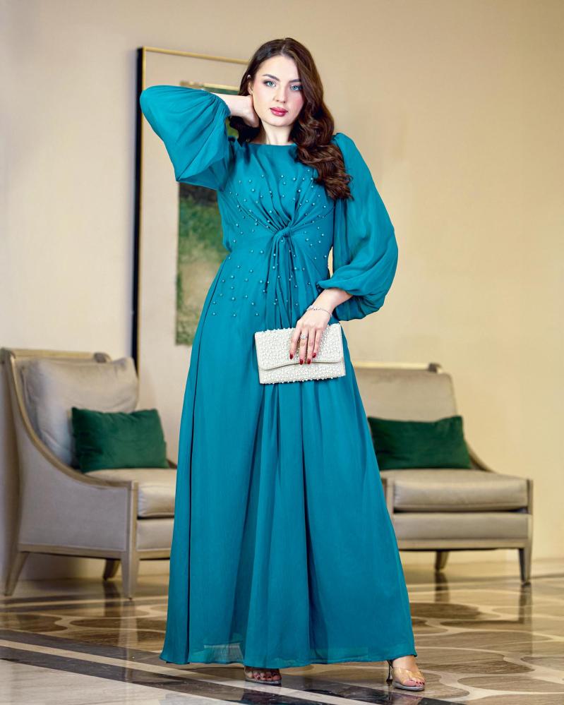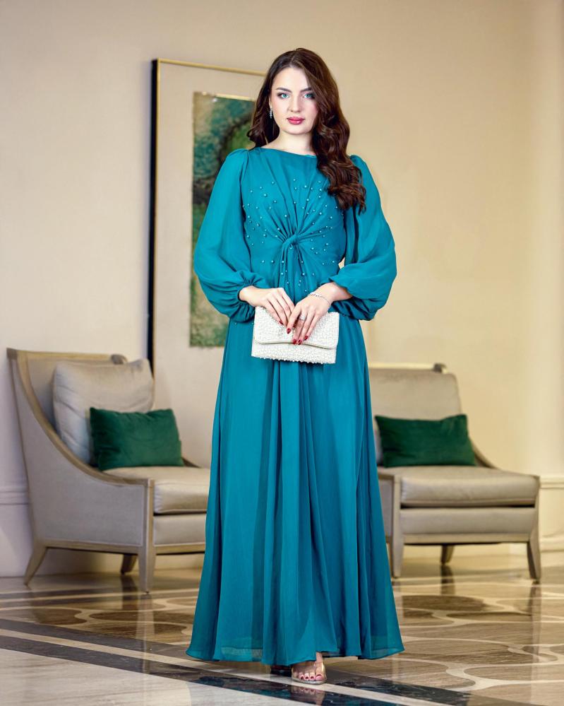 فستان شيفون تركواز بتصميم أنيق وتطريز لؤلؤ فخمه
