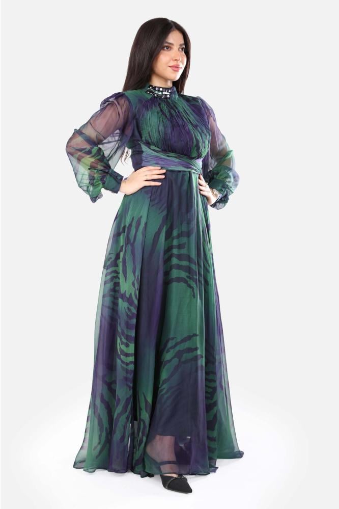فستان شيفون أنيق بلونين أخضر وموف، مزين بلمسات من الكريستال عند العنق وطرف الكم ، مع تصميم مبطن يضمن الراحة والفخامة لإطلالة ساحرة.