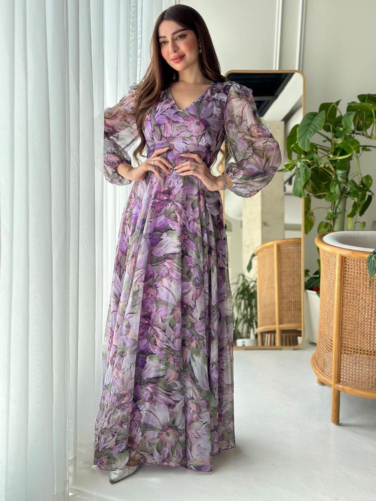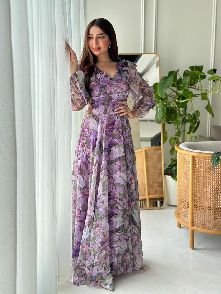 تألقي بإطلالة أنثوية ساحرة مع فستان الشيفون المزين بطبعة الزهور الرائعة، مثالي لجميع مناسباتك الخاصة.