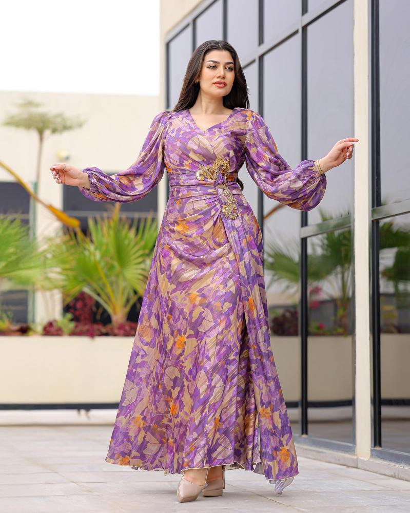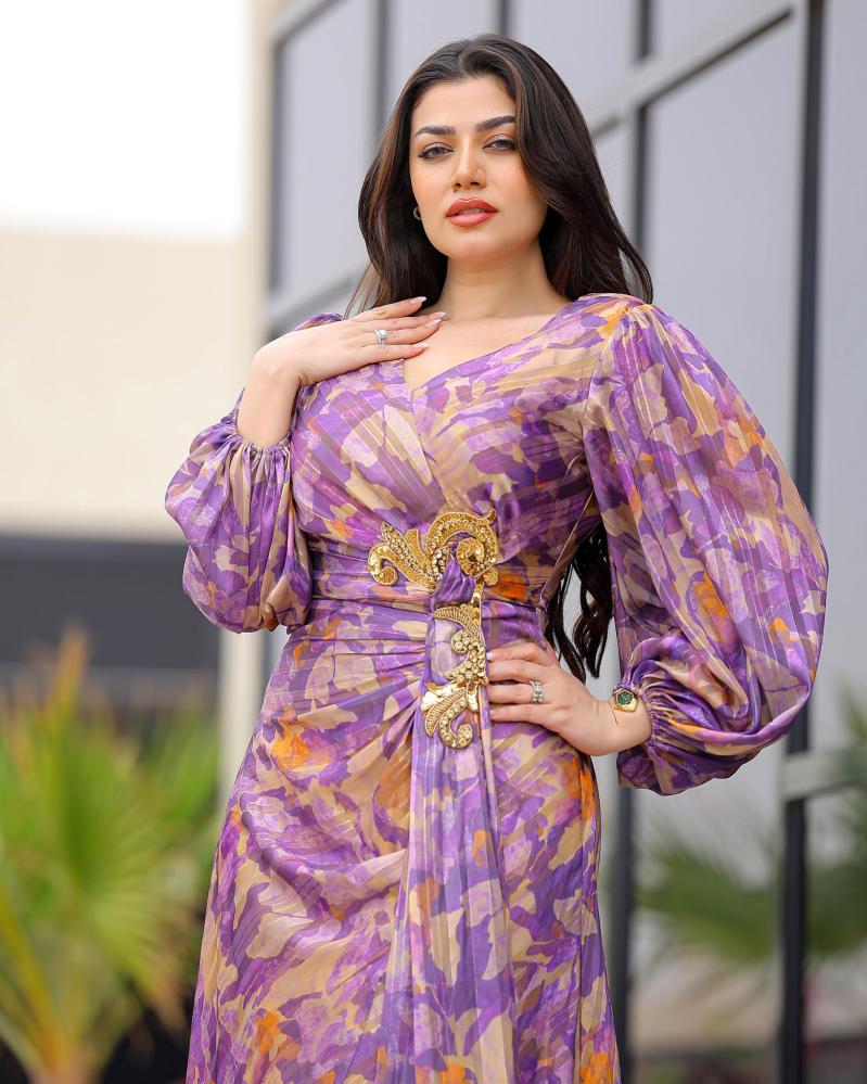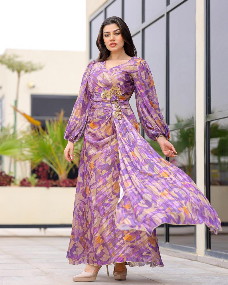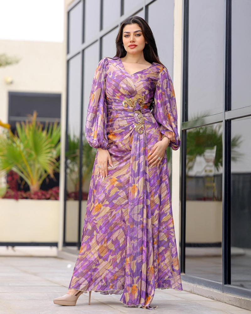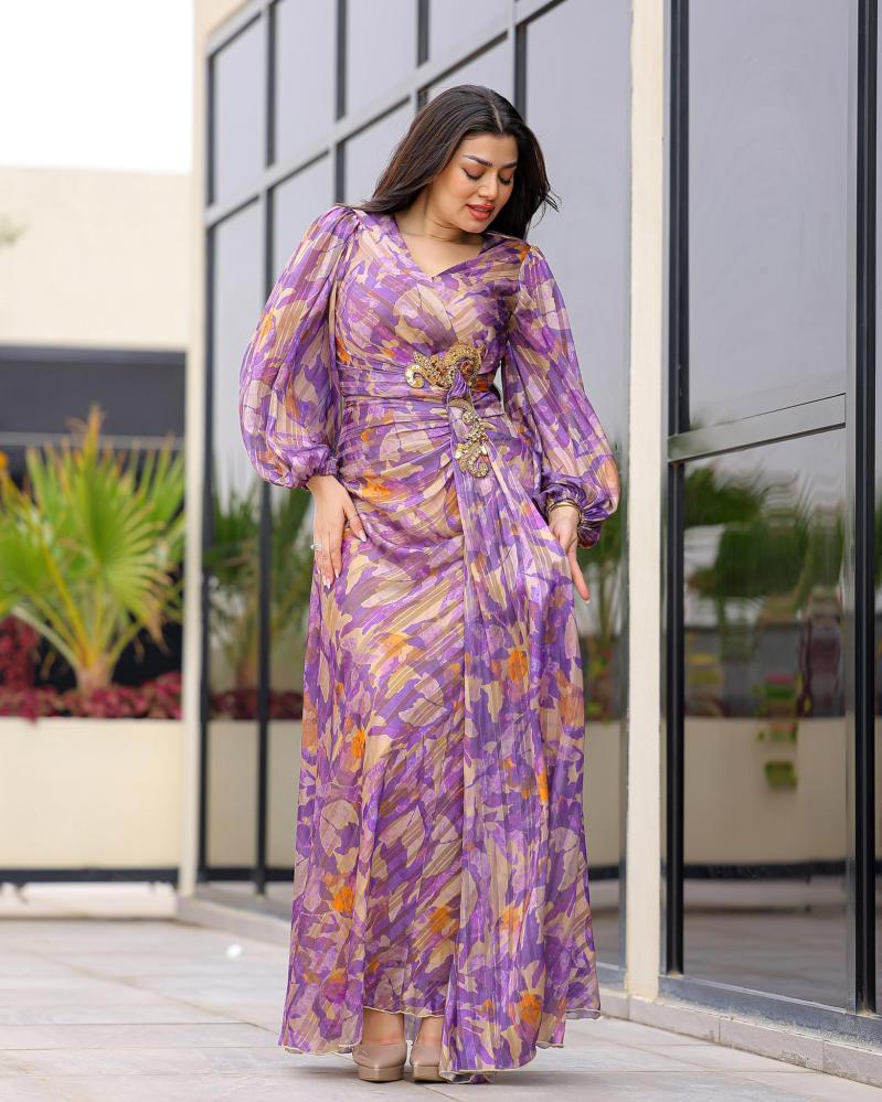 فستان أنيق يعكس فخامة التفاصيل ونعومة التصميم، مصنوع من قماش الشيفون المشجر بتدرجات بنفسجية ودافئة تمنح الإطلالة عمقًا وجاذبية.