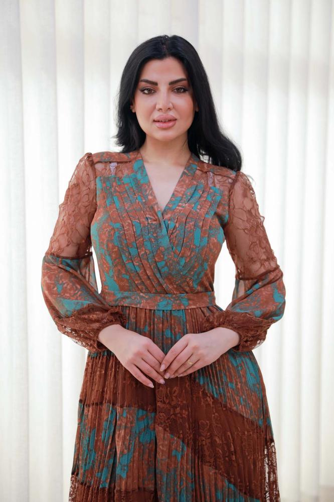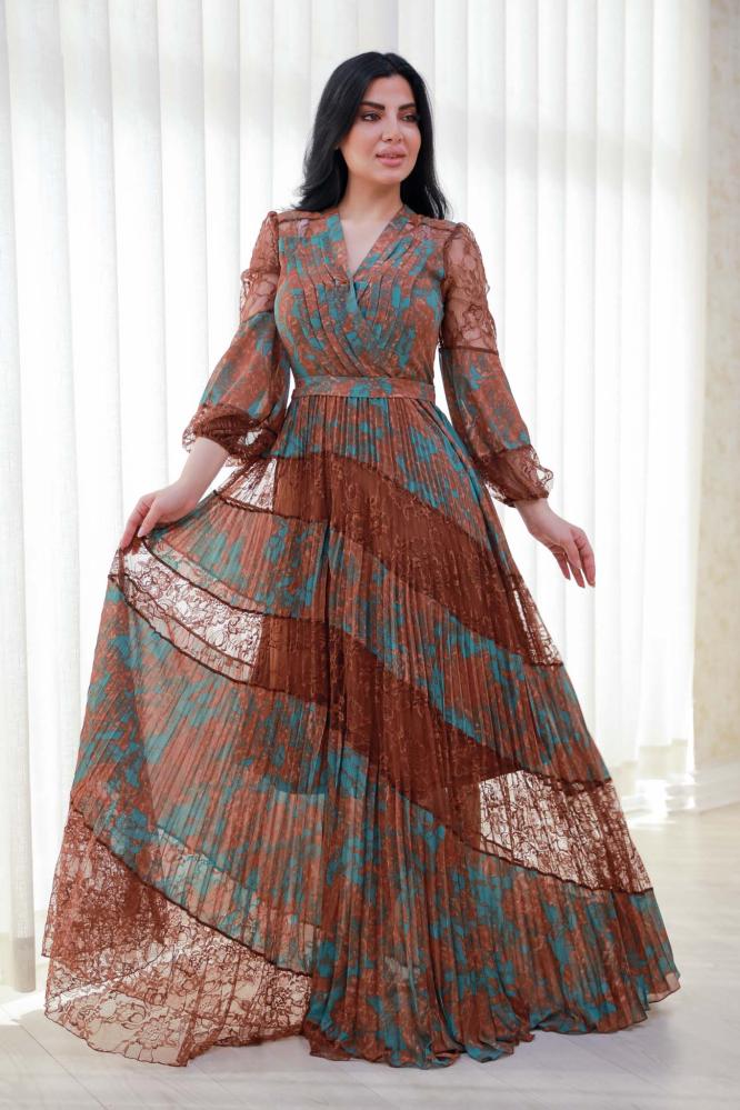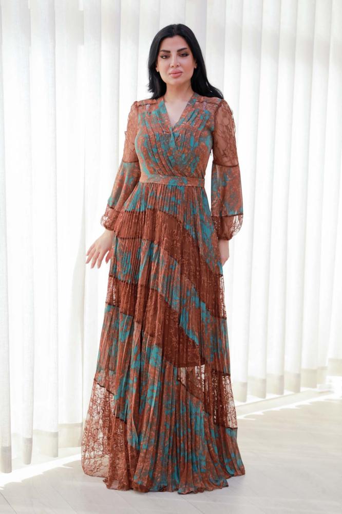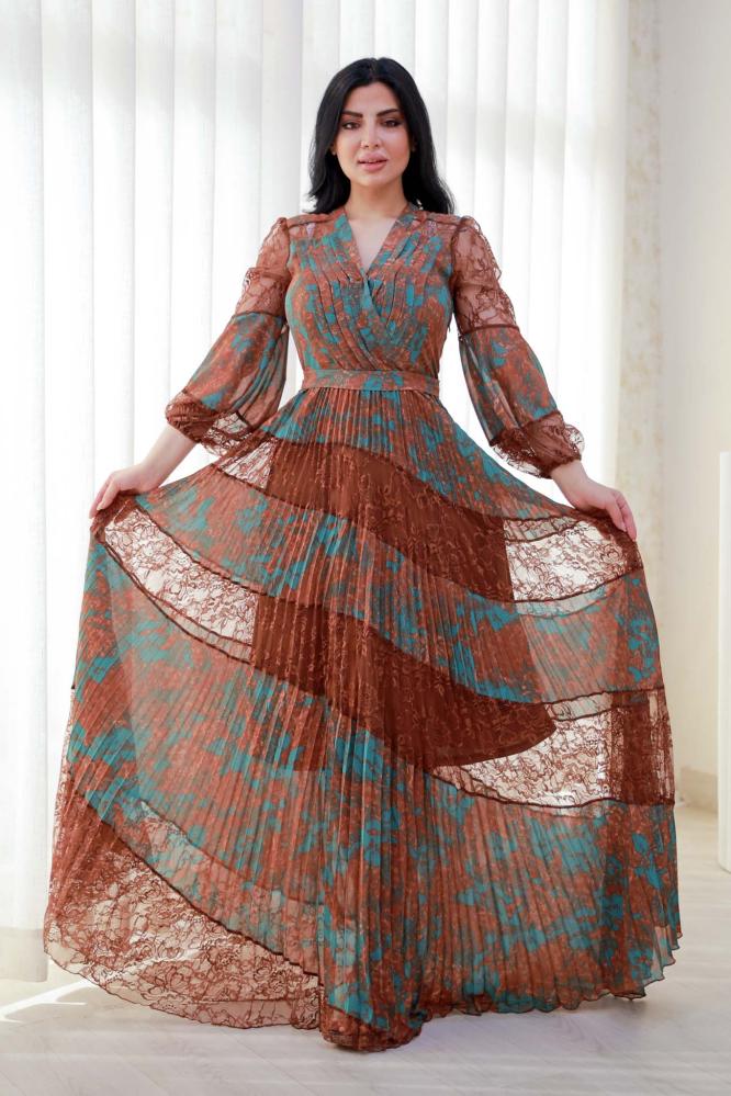استمتعي بجمال التفاصيل في هذا الفستان المصنوع من شيفون مموج بتداخل لوني فني يدمج بين درجات البني والأخضر. الأكمام الطويلة الشفافة من الدانتيل تضيف لمسة فاخرة ناعمة، بينما تمنح القصة الطويلة والكسرات حركة انسيابية جذابة. فتحة الرقبة على شكل V تبرز جمال العنق وتمنح الفستان طابعًا أنثويًا أنيقًا. خيار مثالي للسهرات الراقية والمناسبات الخاصة.