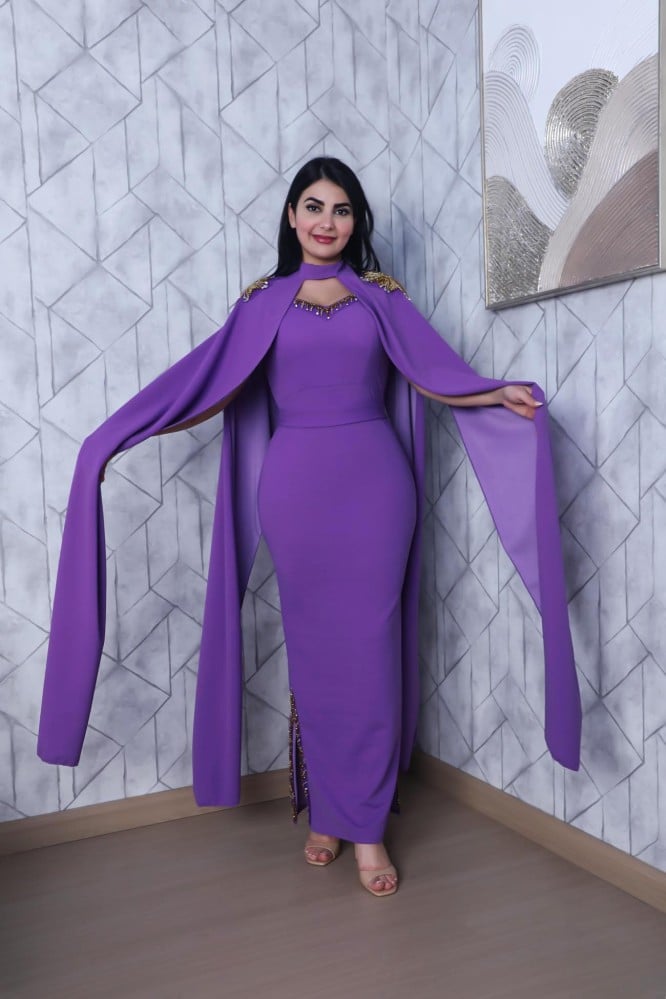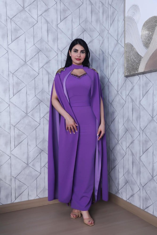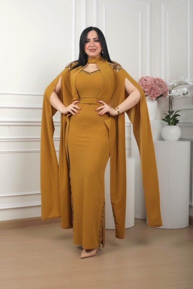 فستان سهره قصة ترند قماش كريب استرش على قطعه خارجيه ع الفستان مطرز من الاكتاف.