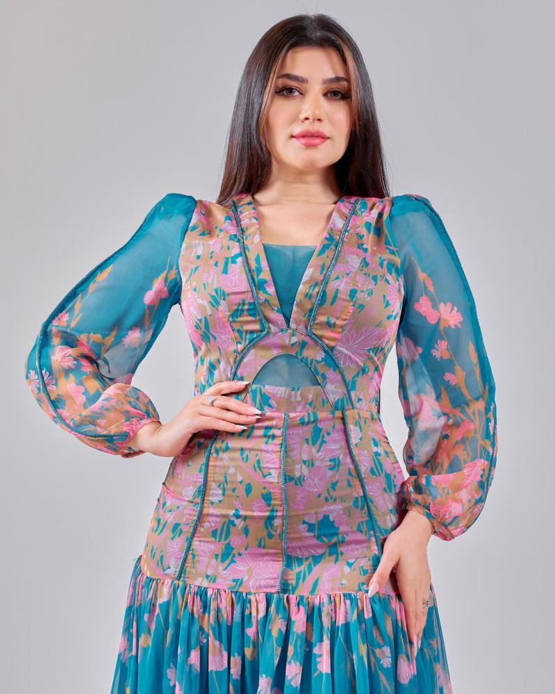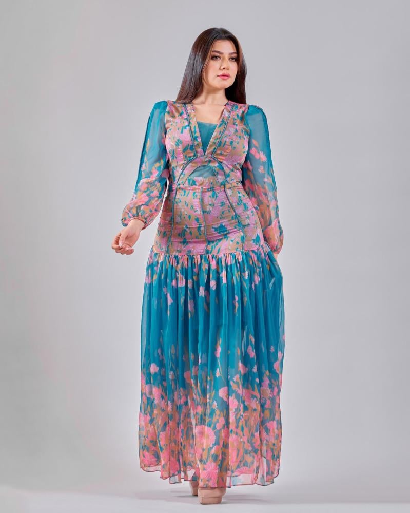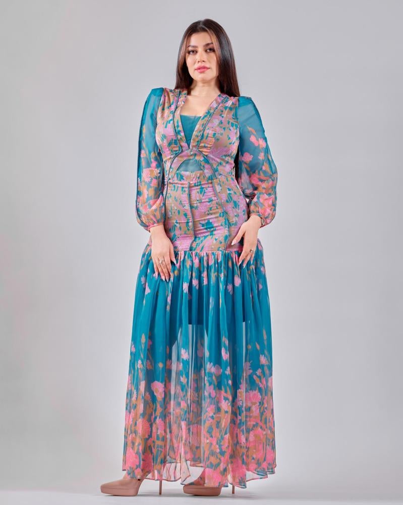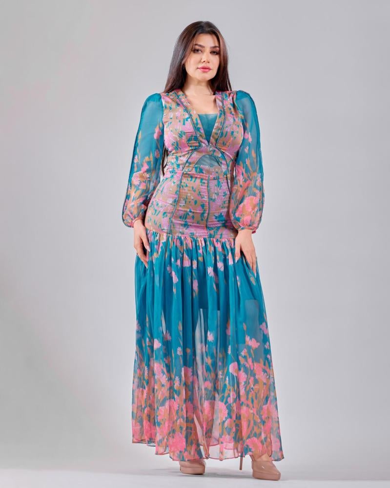 يتميّز هذا الفستان بتصميم يجمع بين الأناقة والحضور اللافت، حيث تتناغم النقشة الزهرية مع الألوان المتناسقة لتمنح طابعاً أنثوياً راقياً. الجزء العلوي بقصة محددة تبرز القوام بأسلوب متوازن، بينما تنسدل التنورة بانسيابية ناعمة تضيف حركة خفيفة وجاذبية طبيعية. الأكمام الشفافة تكمل التصميم بلمسة رقيقة تعزز من أناقة الإطلالة، ليكون خياراً مثالياً للمناسبات والسهرات الراقية.