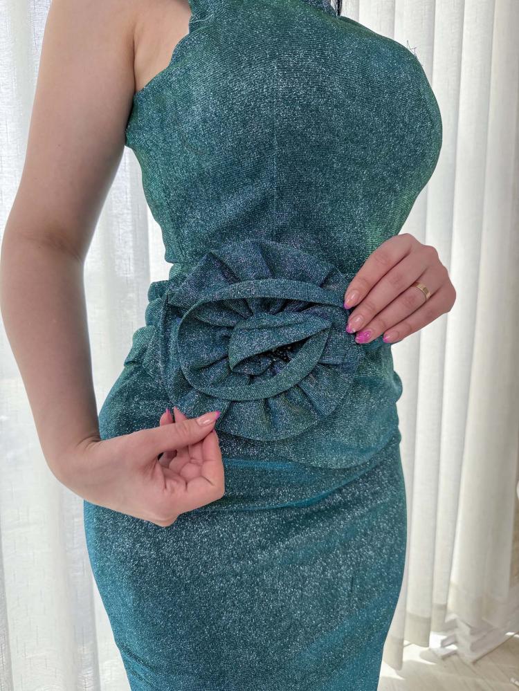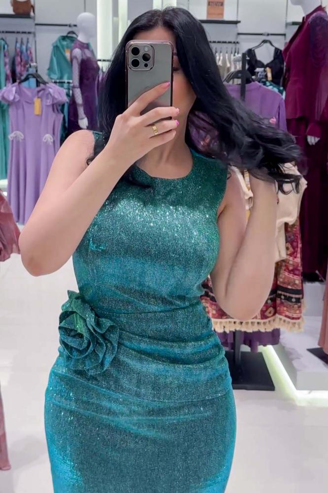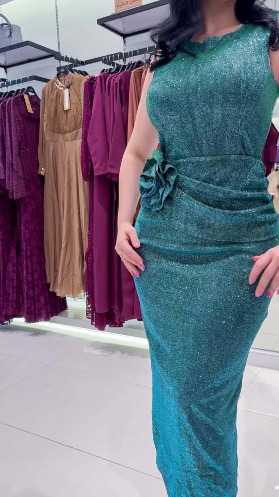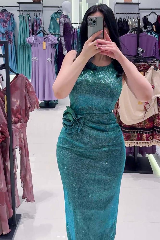 فستان ناعم بلون تيفاني ساحر، بدون أكمام وقصة ناعمة تبرز القوام، مزين بوردة أنثوية على الخصر لمسة راقية تميز إطلالتك.