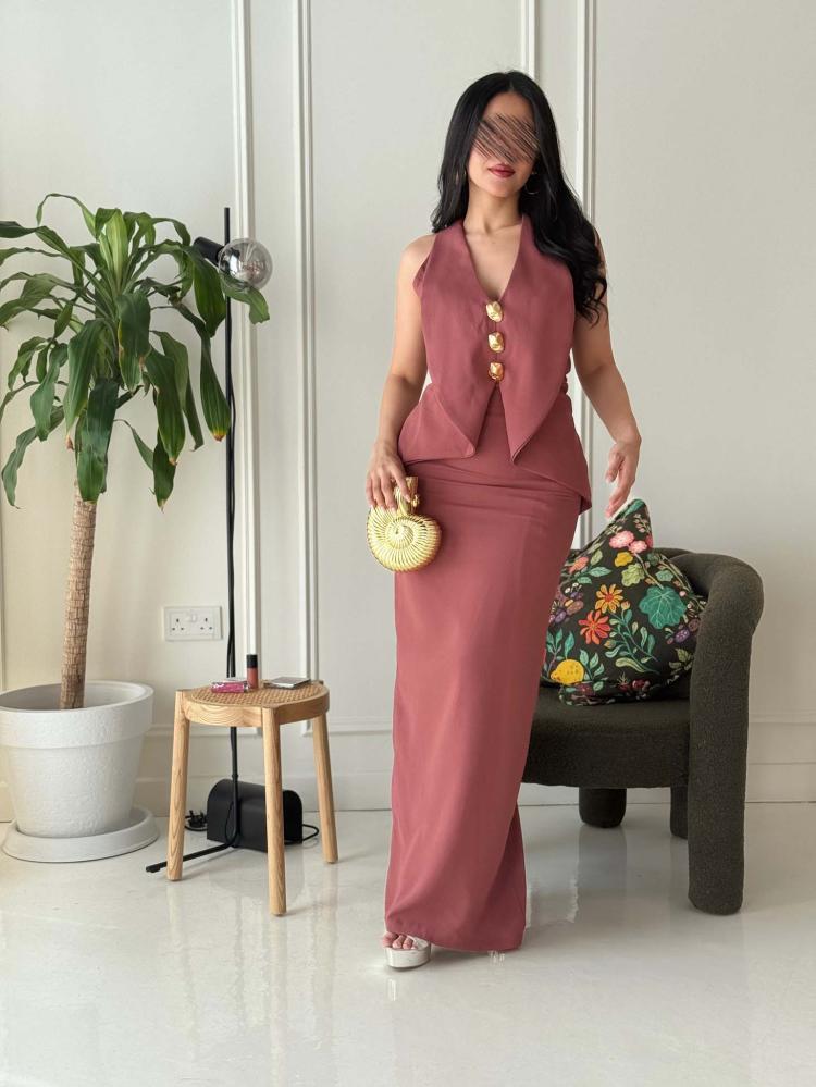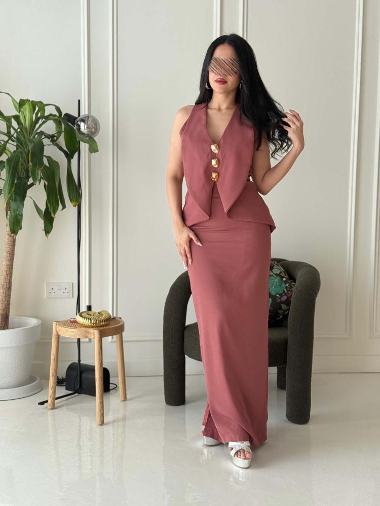 فستان أنثوي أنيق بتصميم أوف شولدر يكشف الأكتاف بطريقة ناعمة وجذابة. مصنوع من قماش الكريب المعروف بمرونته وشكله المرتب، ويأتي بلون وردي يوحي بالنعومة والهدوء. الأزرار الذهبية الأمامية تضيف تفاصيل بارزة وراقية للفستان. مناسب لإطلالات يومية أنيقة أو مناسبات خفيفة وعزائم راقية.