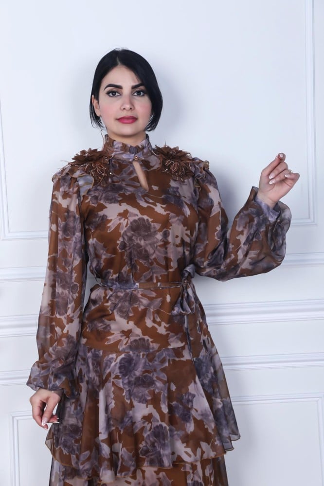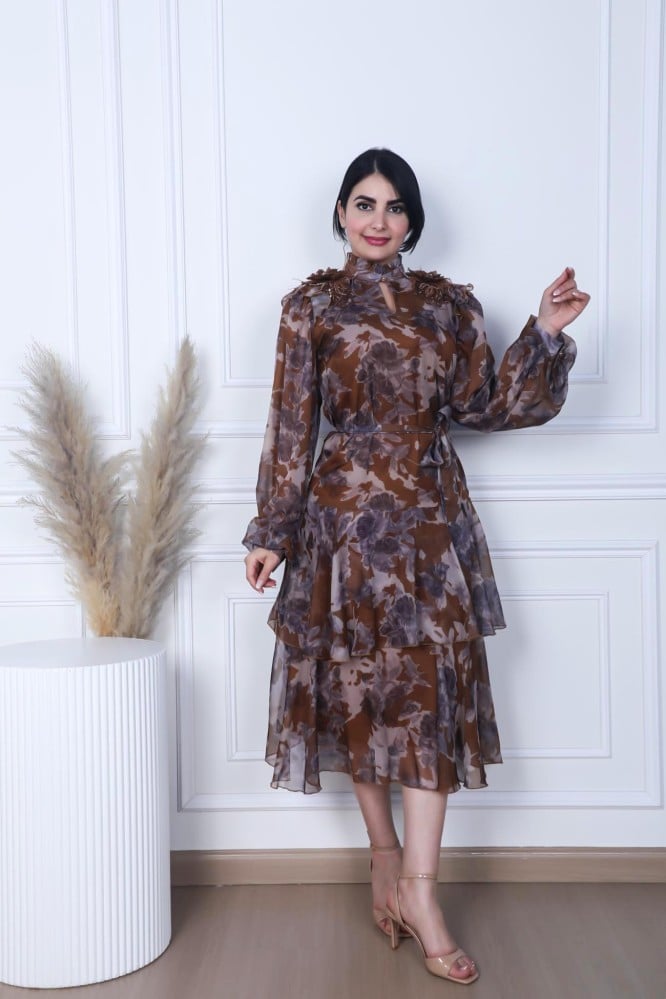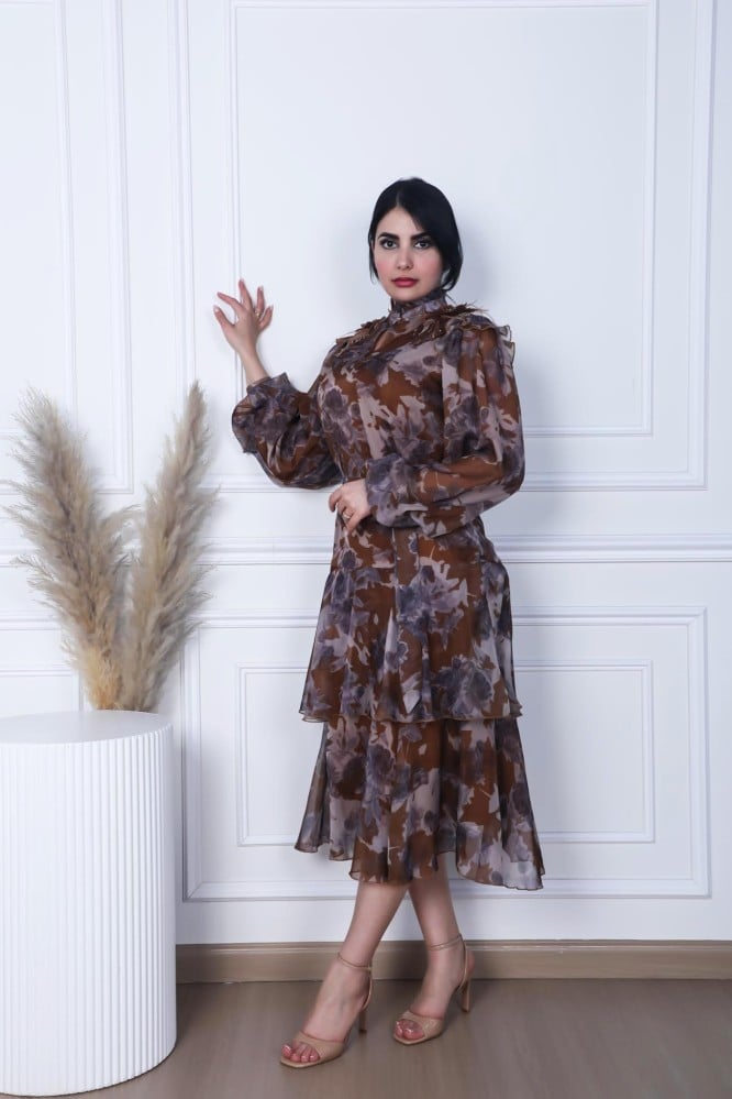 فستان ميدي مشجر لون بني طبقات على رسمات ورد ع الاكتاف طبقات مع حزام