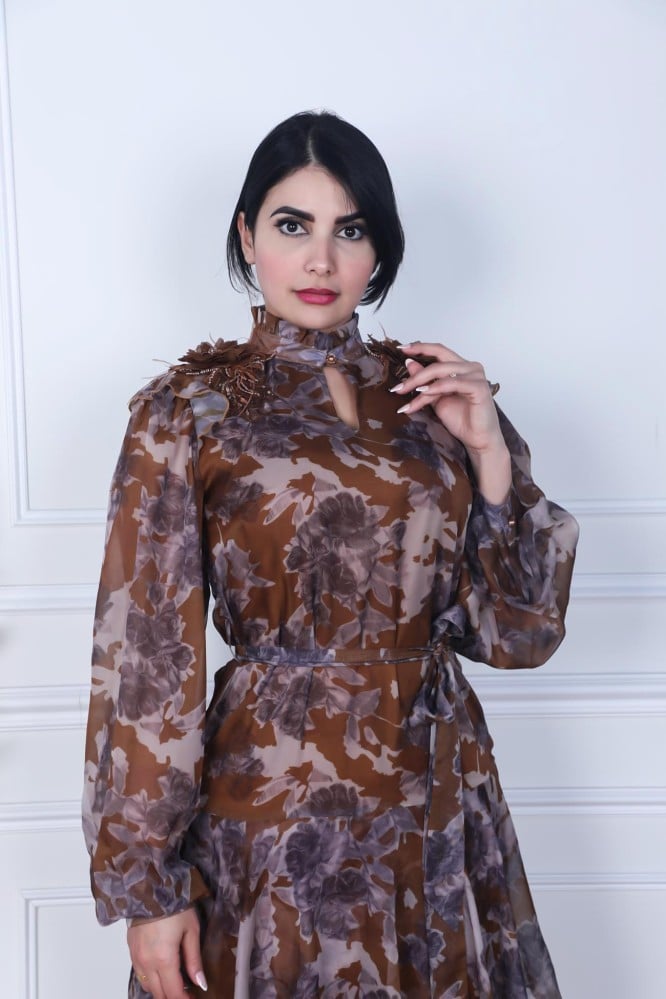 فستان مشجر شيفون لون بني
