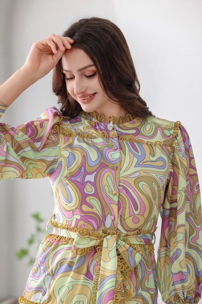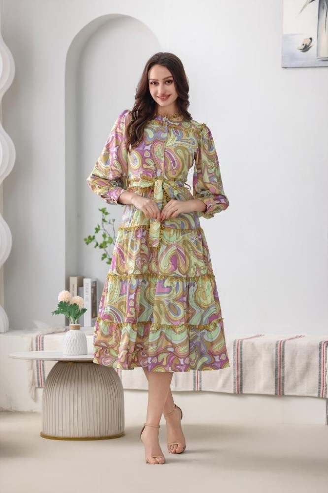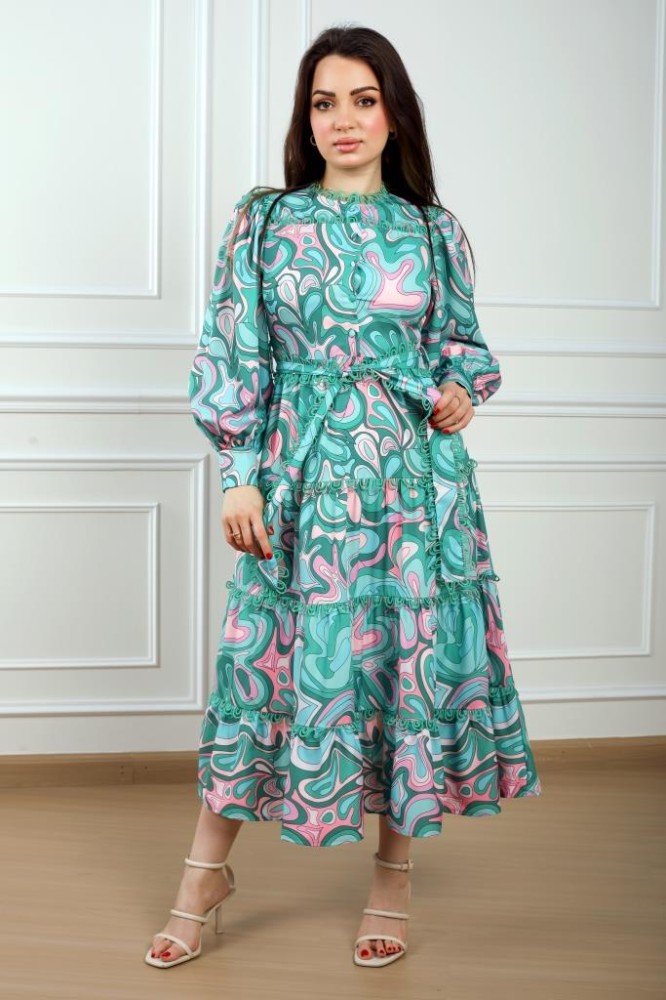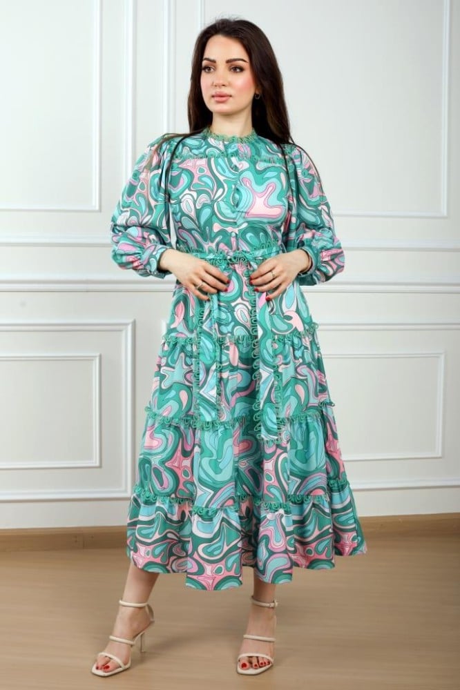 فستان مشجر ميدي مموج طبقات على حزام