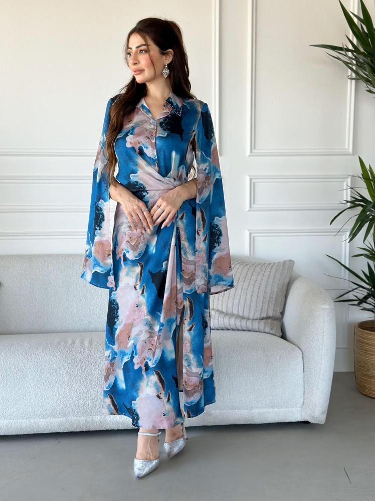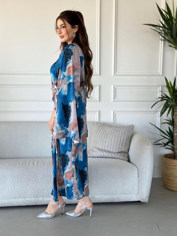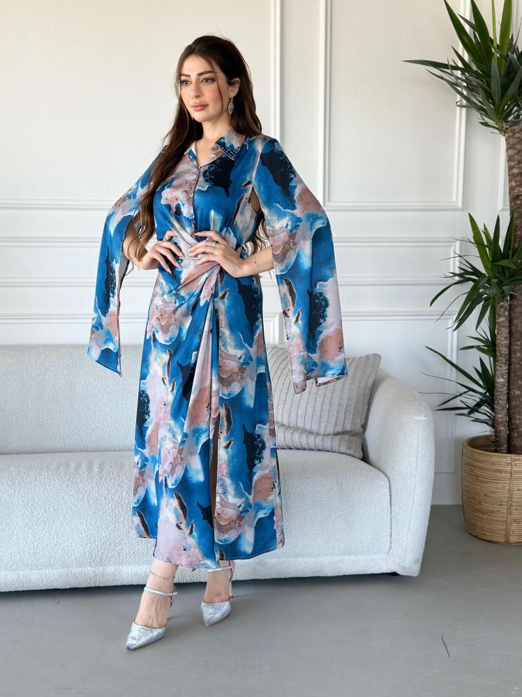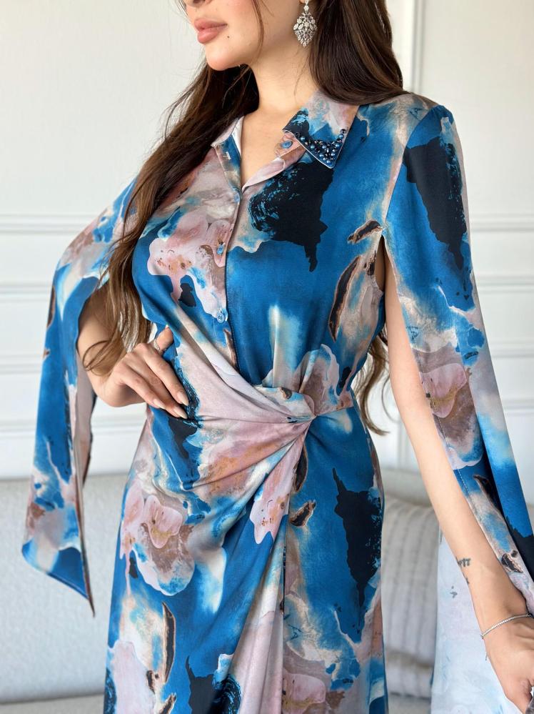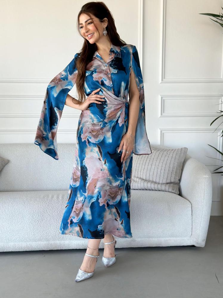 فستان حريري أنيق يتميز بنقشات جذابة وأكمام واسعة لإطلالة فاخرة وساحرة في المناسبات الخاصة.