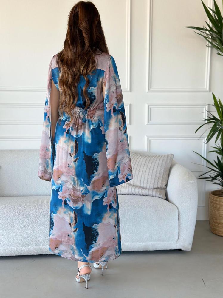 فستان منقش بدرجات الازرق والبيج باكمام طويلة وواسعة ومفتوحة والقلبة مزينه بلول