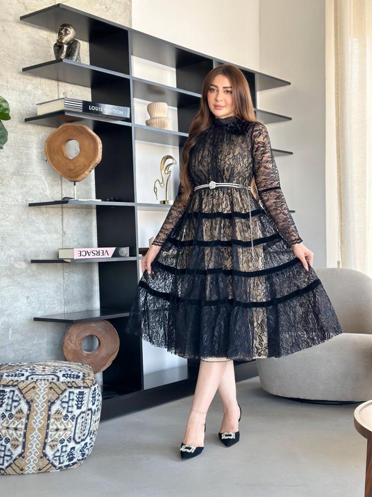 فستان دانتيل أنيق مزود ببطانة استرتش لراحة تامة ومظهر جذاب، تصميم مثالي للسهرات والمناسبات الخاصة.