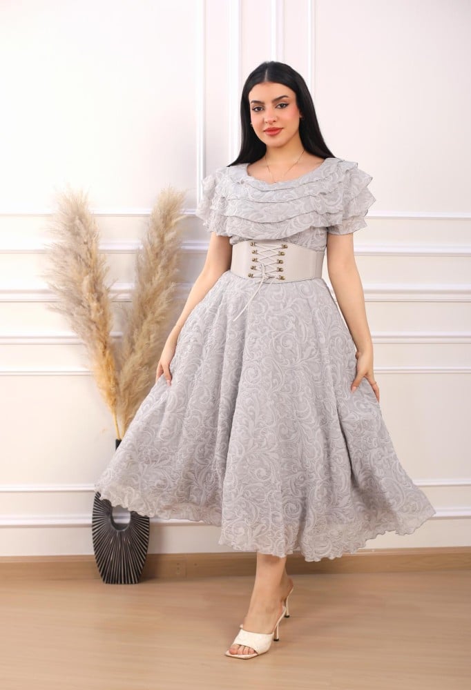 فستان ميدي اكمام قصير الصدر طبقات شيفون على حزام عريض فخم