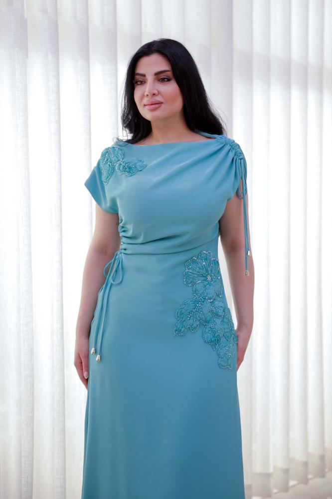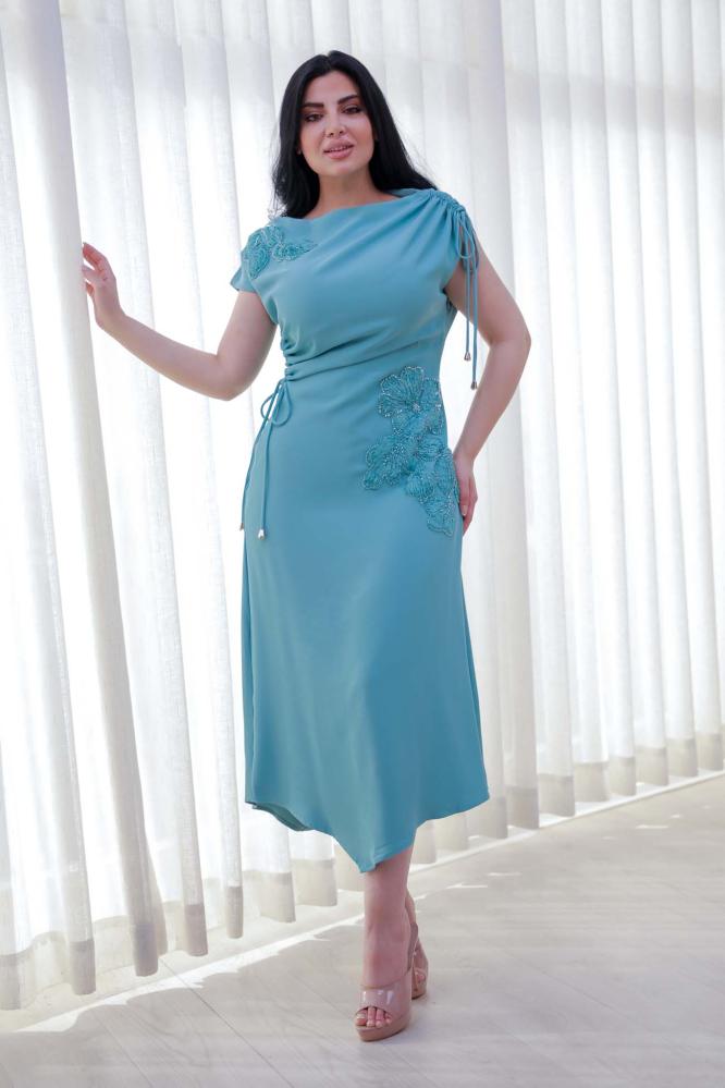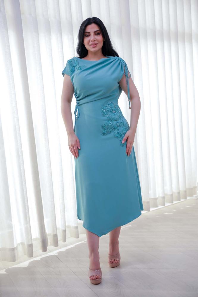 فستان ميدي ناعم من قماش الكريب بلون تيفاني، مزين بشك يدوي راقٍ على الكتف والخصر لإطلالة أنثوية ناعمة وفاخرة.