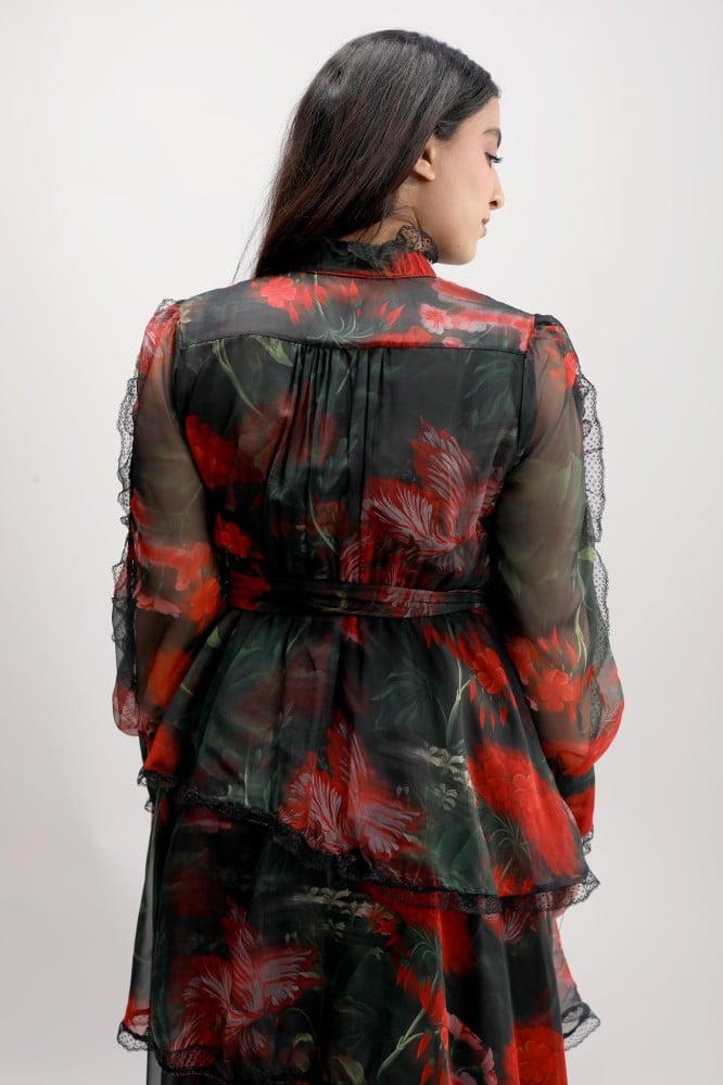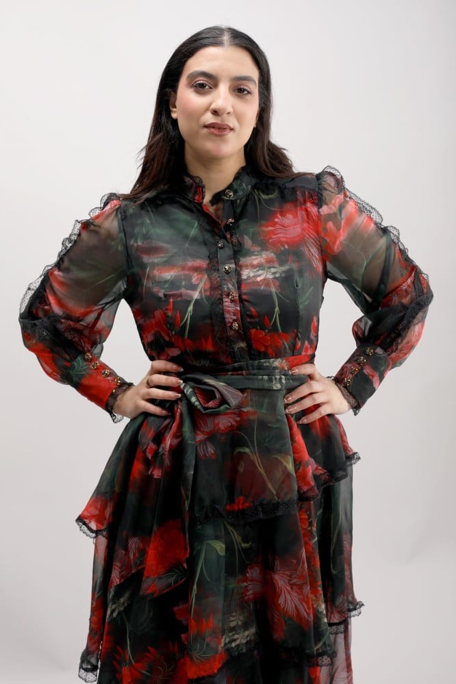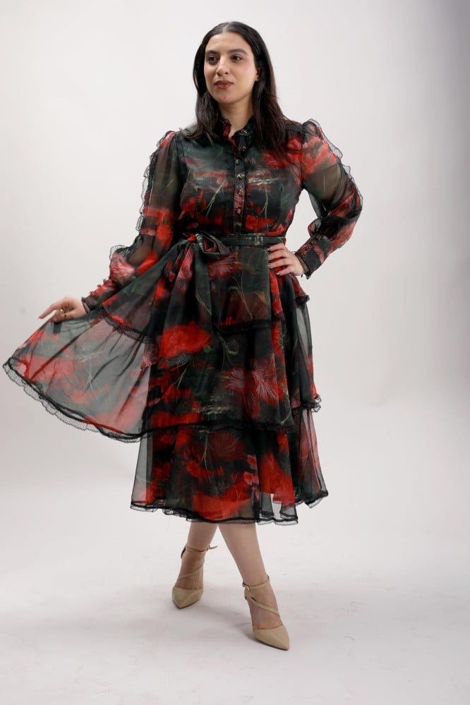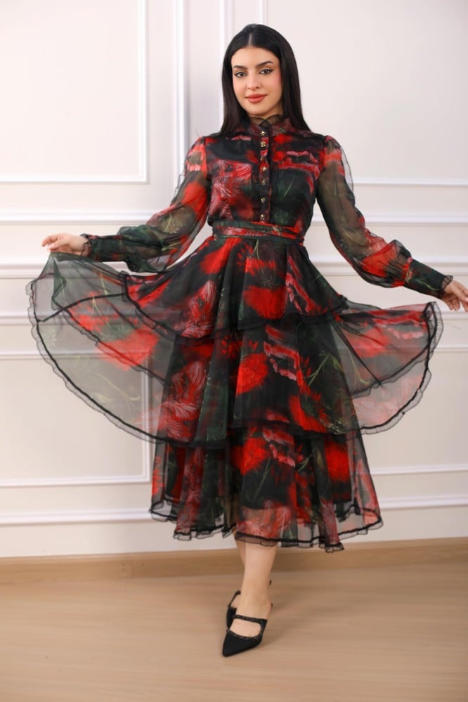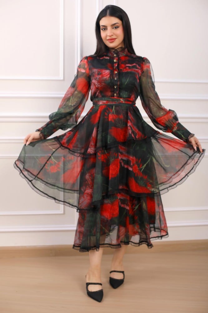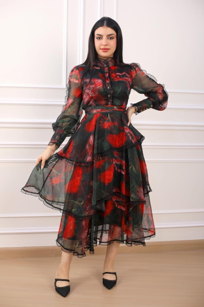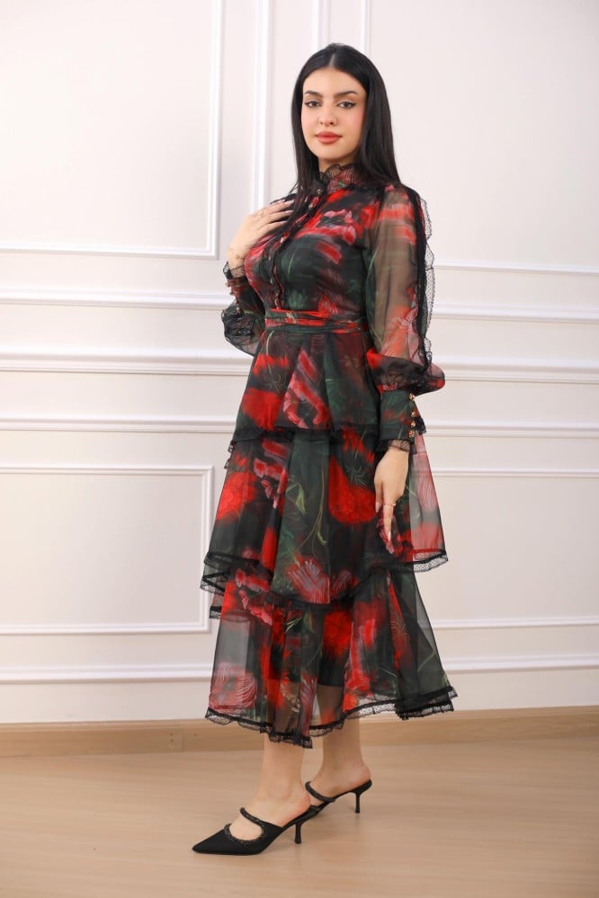 فستان مشجر رائع بتصميم طبقات مع توريدات متداخلة باللون الأحمر على الأسود، مما يضفي عليه لمسة من الأناقة والجاذبية. يأتي مع شريطة وحزام بنفس اللون لتعزيز القوام، بالإضافة إلى الأكمام الطويلة المزينة بأزرار ذهبية لتكمل الإطلالة الفاخرة. هذا الفستان هو الخيار المثالي للمناسبات الخاصة والسهرات الفاخرة.