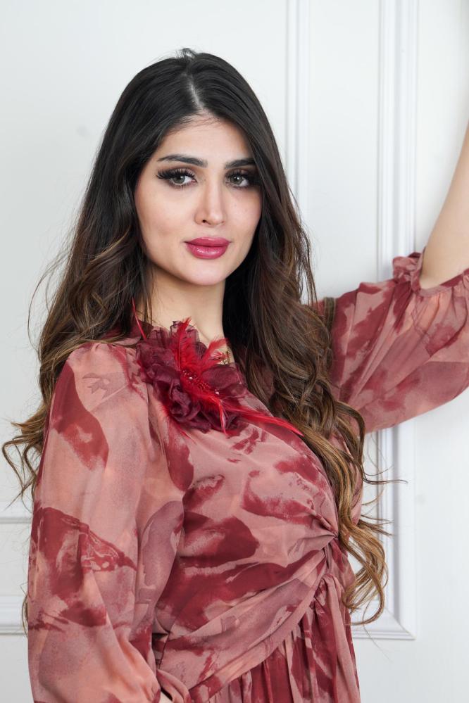 تألقي بجاذبية مع هذا الفستان الميدي المصنوع من الشيفون المشجر الناعم، بتصميم يعكس الأنوثة والفخامة. يتميز بأكمام طويلة بتصميم منفوش يضفي لمسة ناعمة، مع ياقة أنيقة تعزز من جمال الإطلالة. تكتمل جاذبيته بوردة بارزة على الكتف تضفي لمسة فريدة وأنثوية. قصة الخصر المنسدلة تمنحك مظهراً راقياً، مما يجعله مثالياً للمناسبات الخاصة والإطلالات الراقية.
