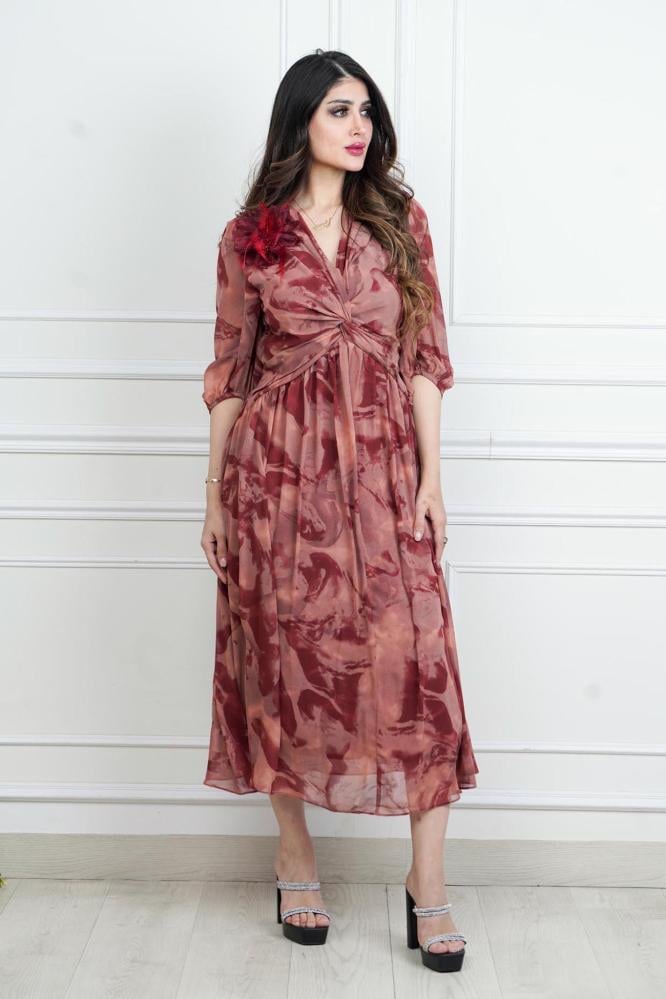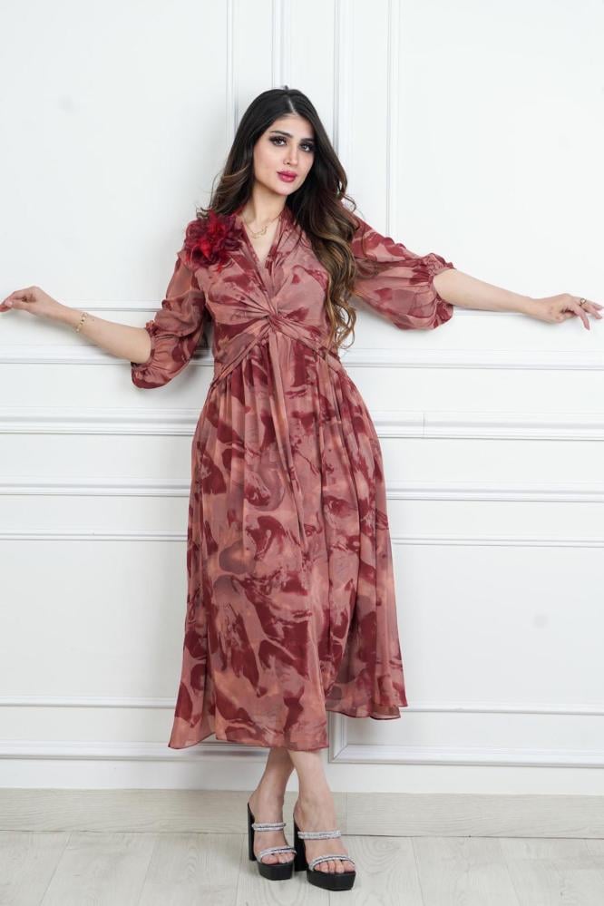 إطلالة أنثوية راقية مع هذا الفستان الميدي المصنوع من الشيفون المشجر، يتميز بأكمام طويلة وقصة أنيقة مع وردة بارزة على الكتف لمظهر ساحر.