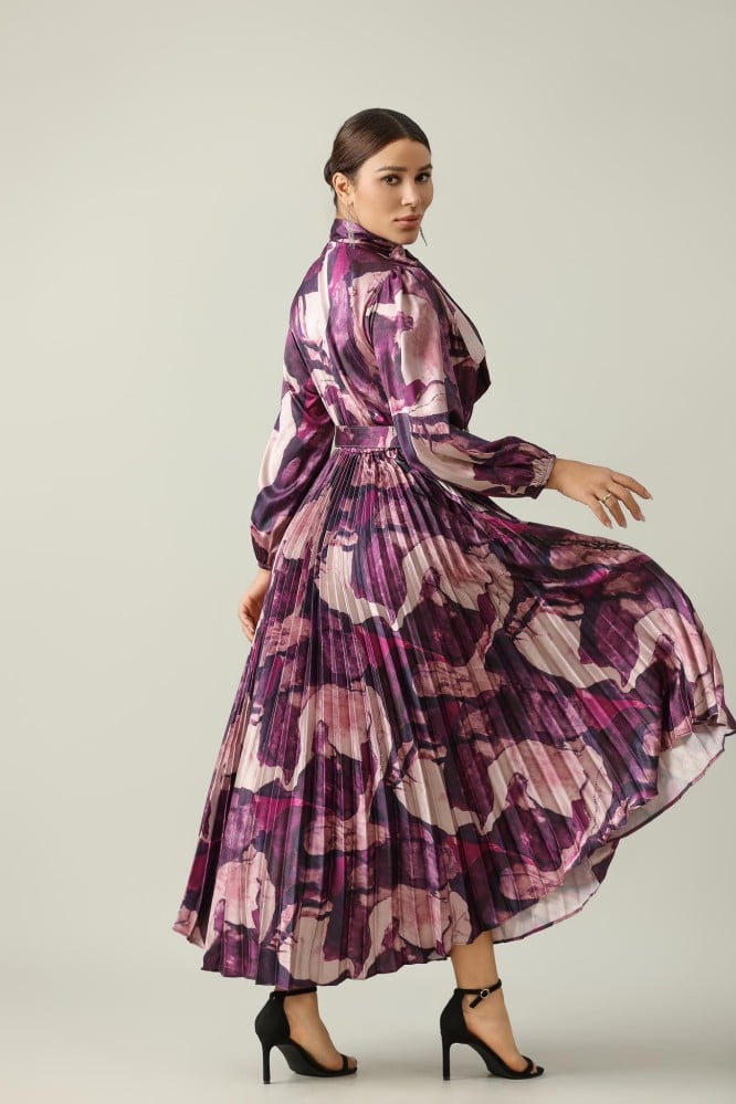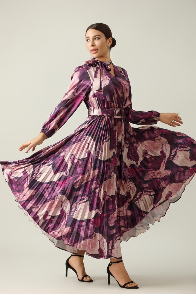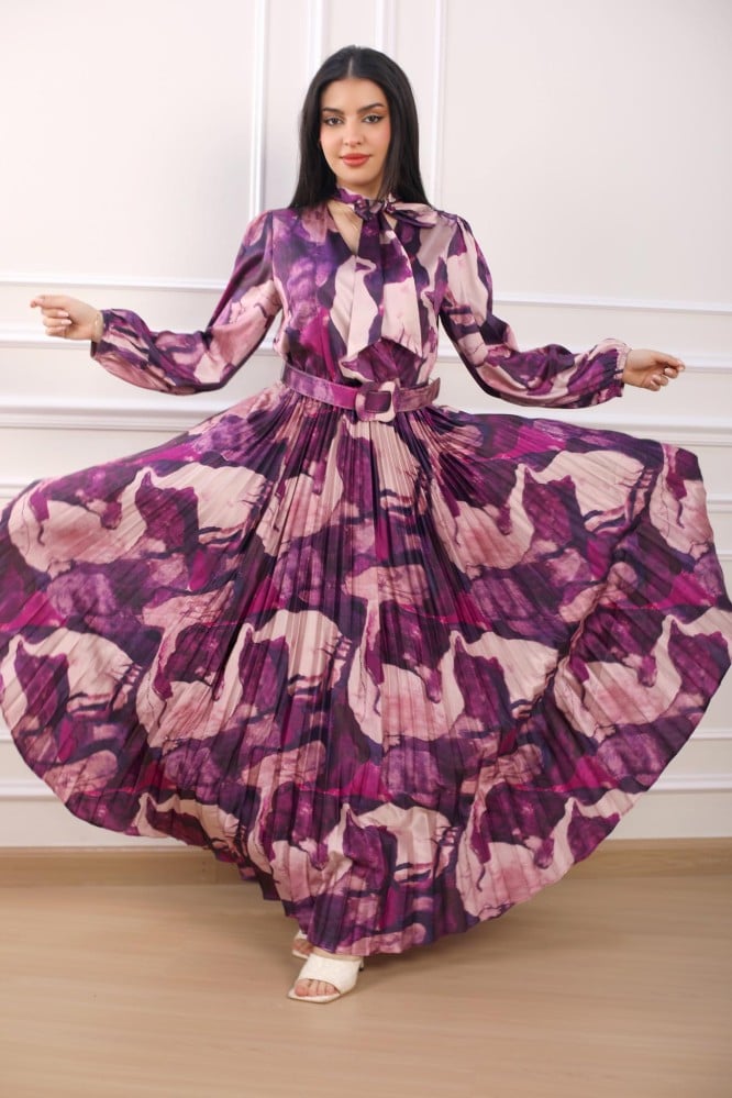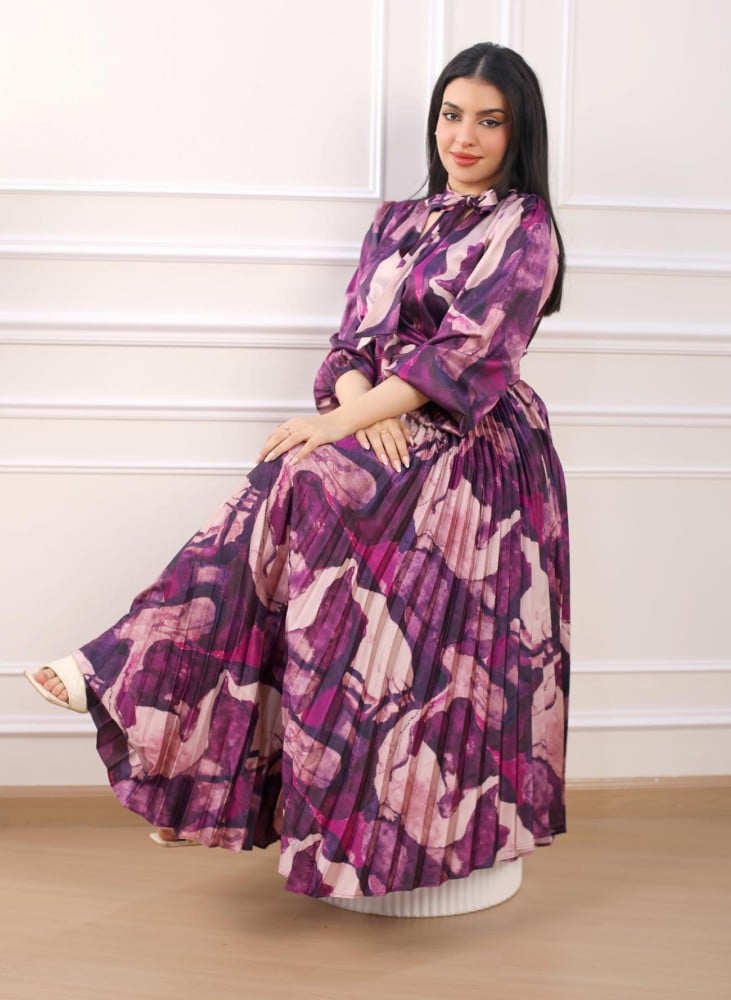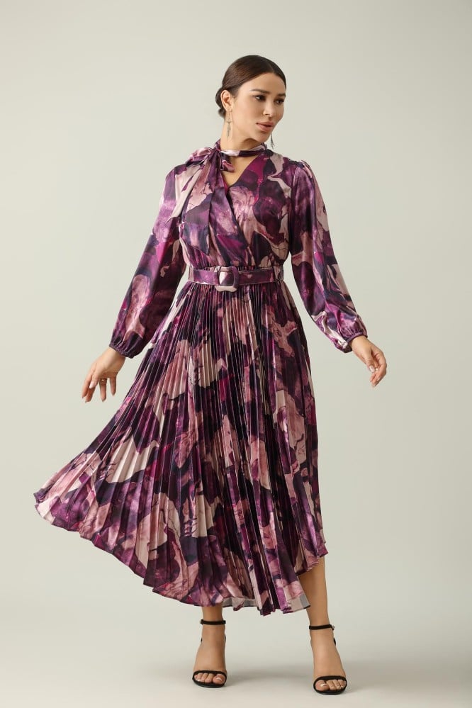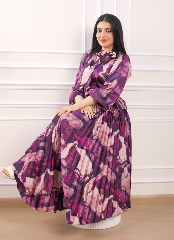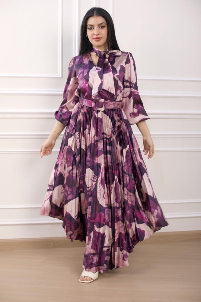 فستان ميدي كسرات اكمام طويلة على ربطه عنق قصة لف من الصدر ومكسر من الاسفل
