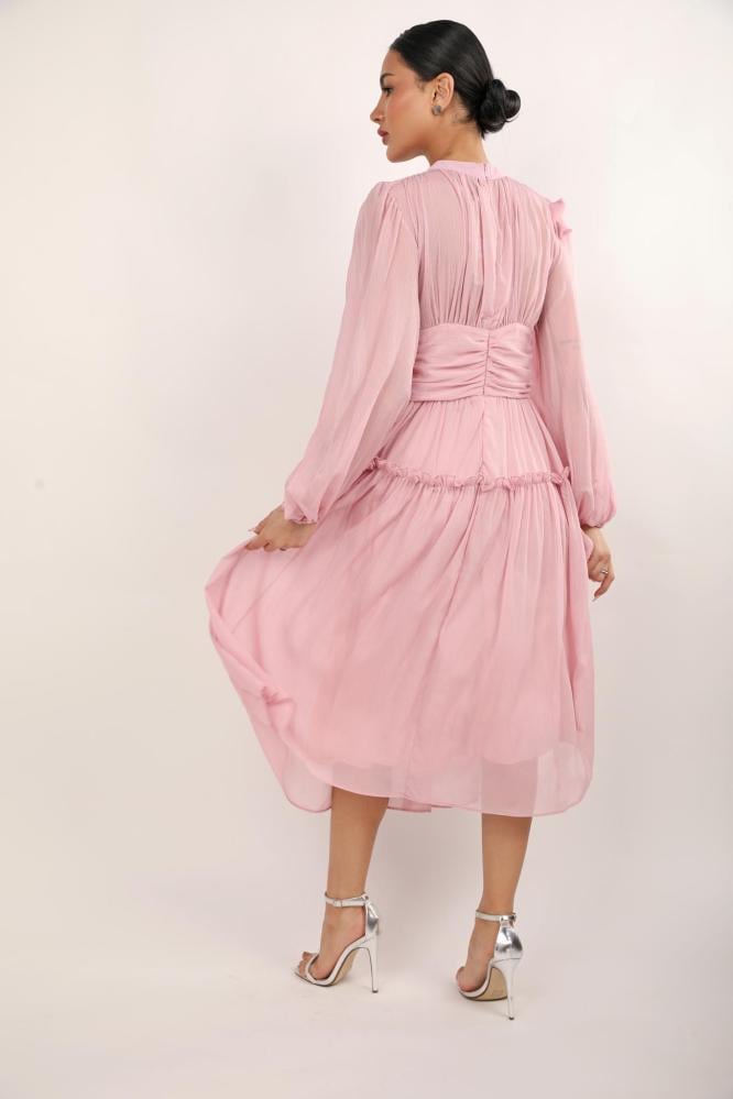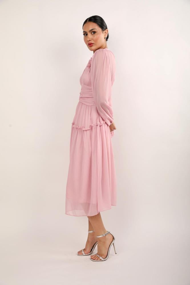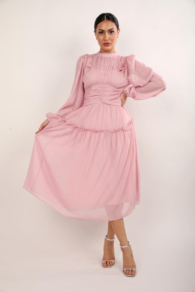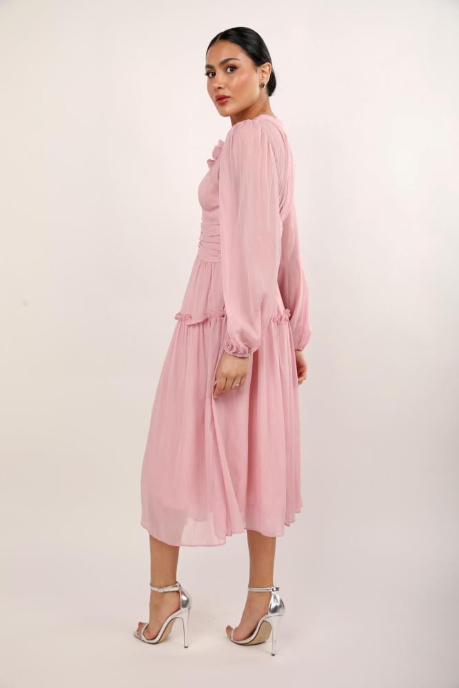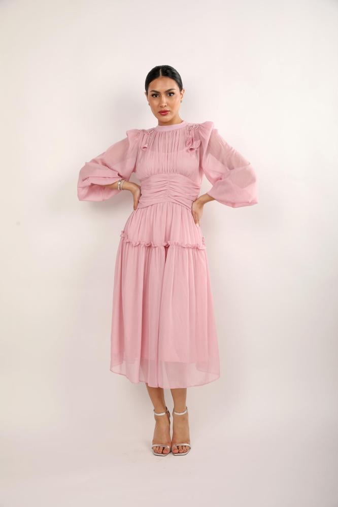 استمتعي بالتألق في كل مناسباتك مع هذا الفستان الوردي الراقي، المصنوع من أجود أنواع الحرير المنسدل بنعومة. تصميمه المميز بكشكشة دقيقة على الصدر والأكمام الطويلة المنفوشة يجعله قطعة فريدة من نوعها، مثالية لأيامك الخاصة أو حتى لقاءاتك المسائية الأنيقة.