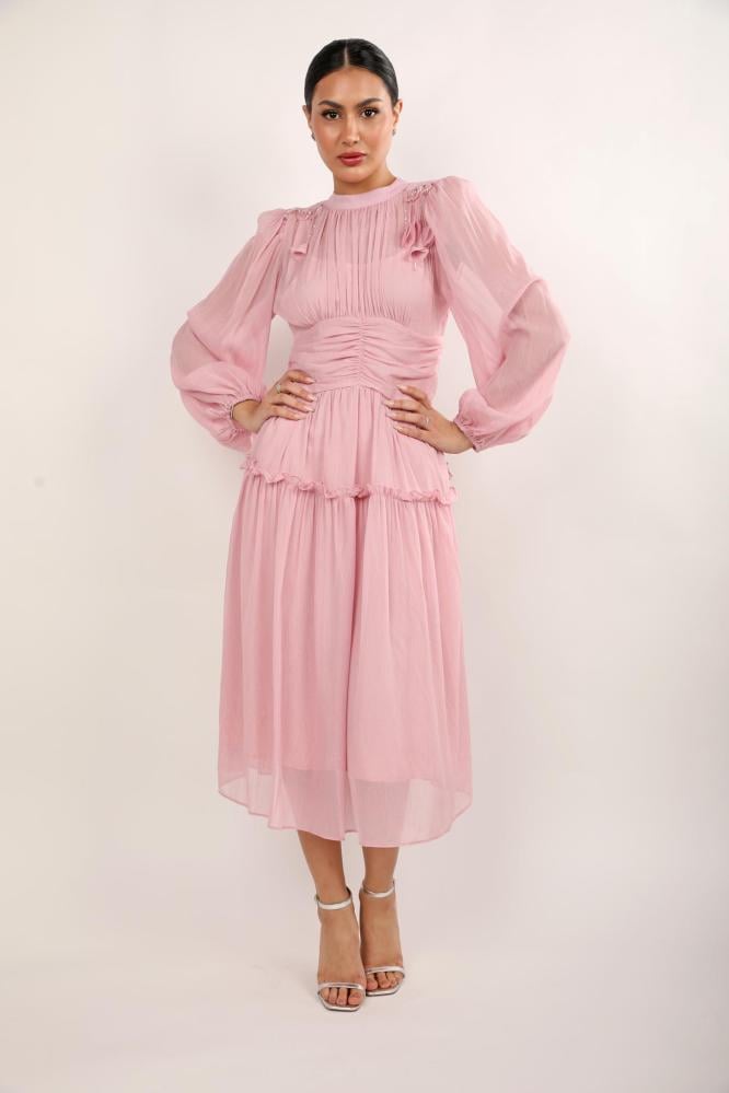 فستان ميدي لون زهري باكمام طويلة قماش حرير لمعة على تطريز وفي الاكتاف هدب ورد فكره ترند على طبقات