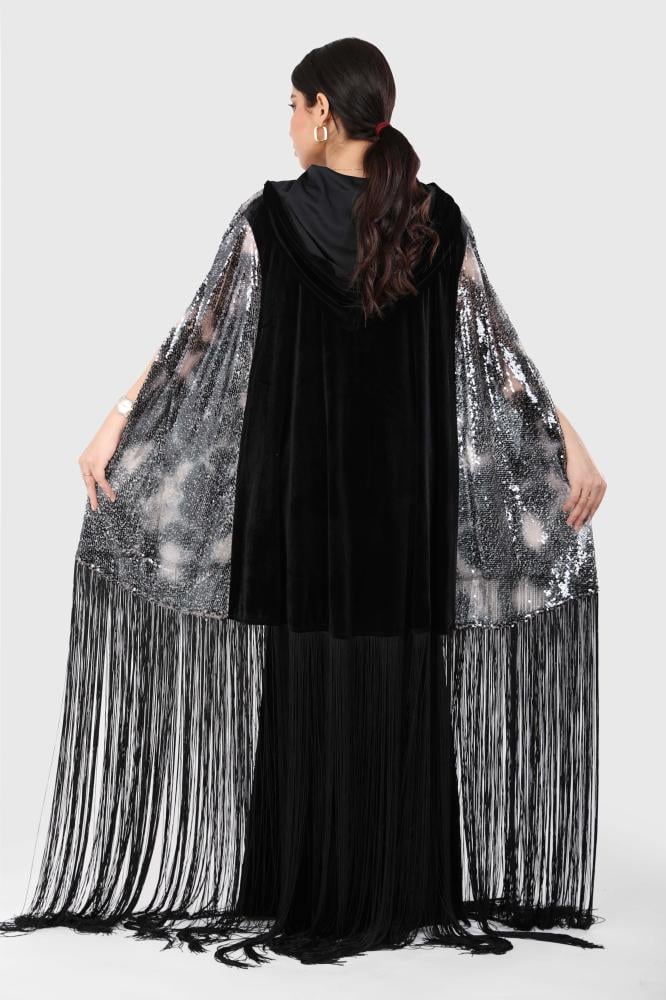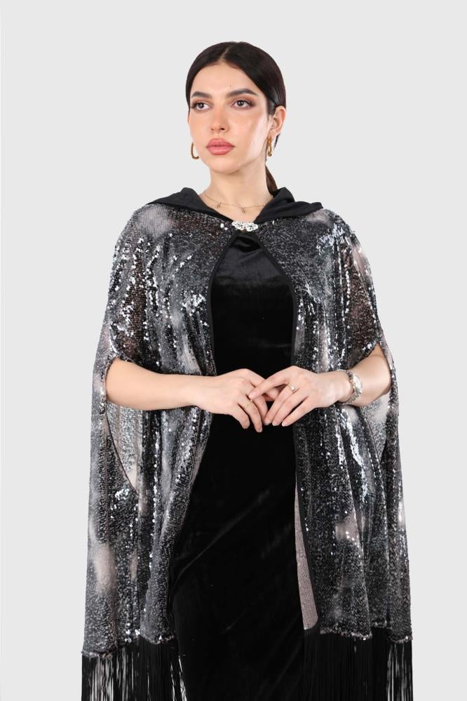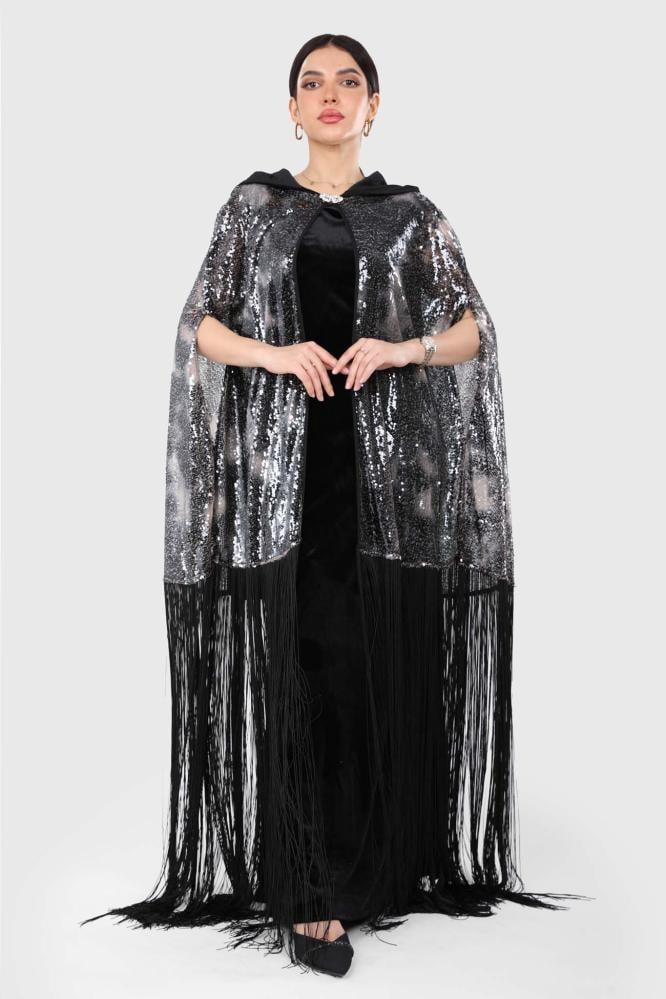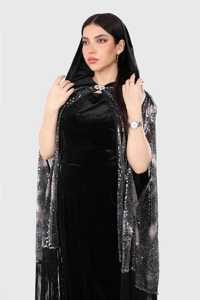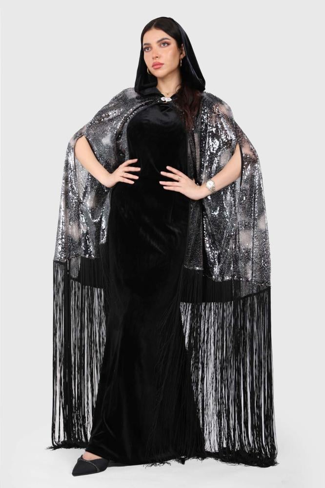قفطان سهرة مخمل أنيق مع وشاح من قماش الترتر وهدب من الأسفل، لإطلالة فاخرة وجذابة تناسب المناسبات الخاصة.