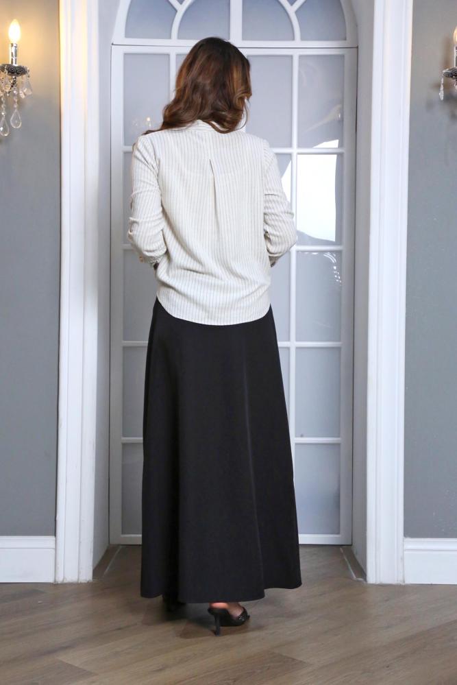 .بلوزة أنيقة بلون أبيض مع خطوط سوداء، مصنوعة من قماش الكتان الناعم.