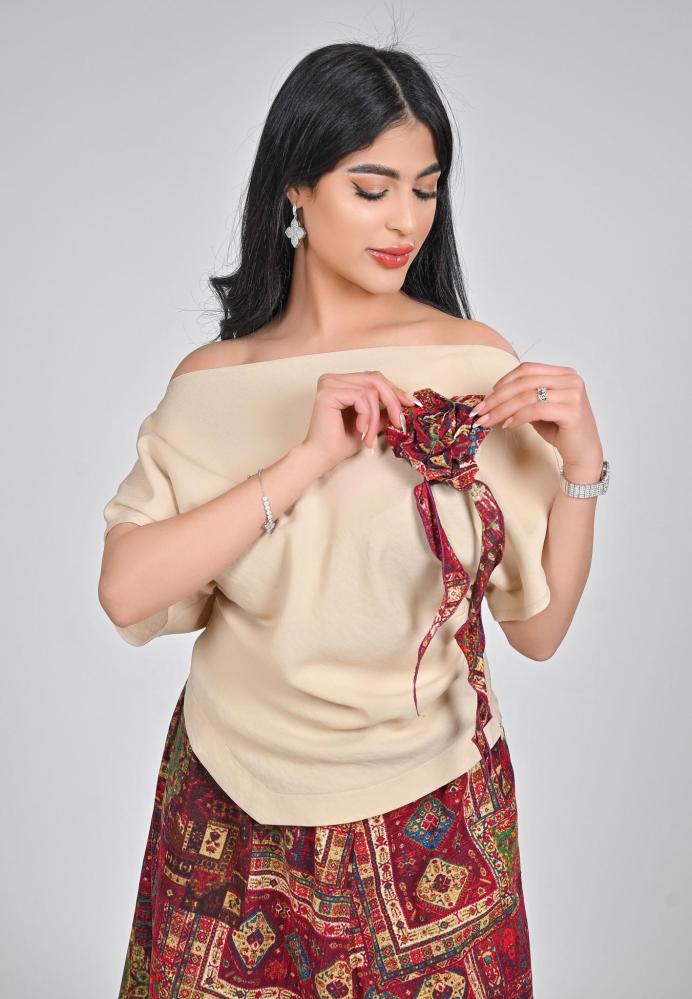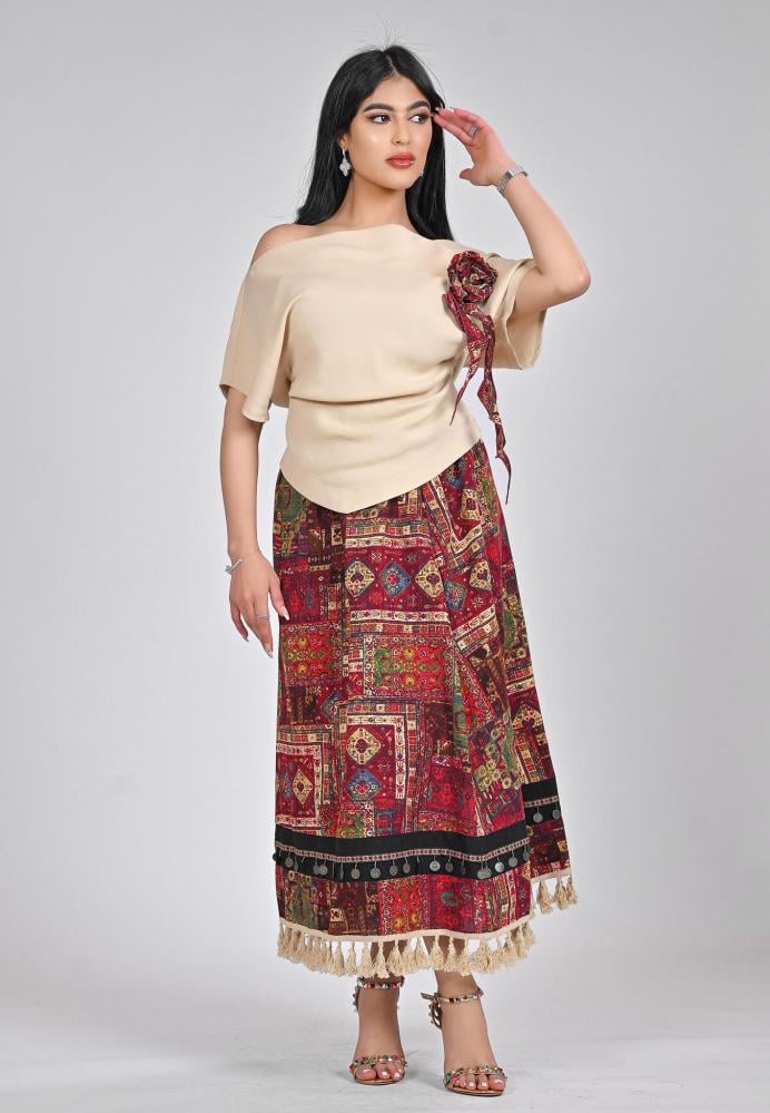 تألقي بأسلوب فريد يجمع بين الرقي والعصرية مع هذا الطقم الأنيق الذي يضم بلوزة بيج بكتف واحد مزينة بوردة ثلاثية الأبعاد، وتنورة منقوشة بتصميم غجري فاخر، لتكوني محط الأنظار في كل مناسبة.