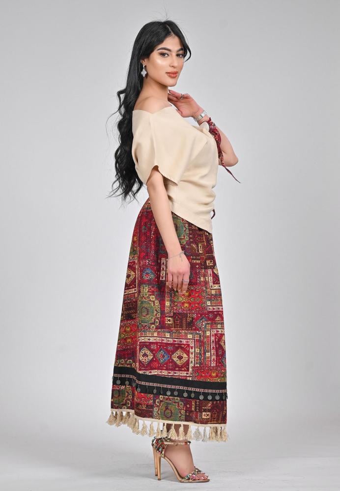 أما التنورة، فهي مصنوعة من قماش فاخر بنقوش غجرية مستوحاة من الفن البوهيمي، بتدرجات لونية دافئة تضفي لمسة من الأناقة العصرية.